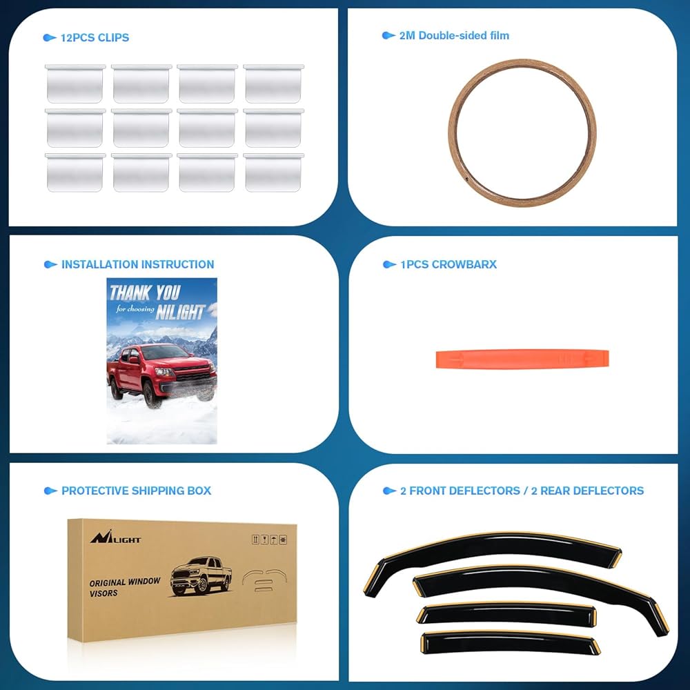 IMPROVE DRIVING EXPERIENCE:Nilight window deflectors are great for all weather conditions,help improve ventilation inside and outside your car to reduce mirror and window fogging while increasing air circulation。With our side window deflectors, it deflects the rain and noise away from your windows to make your driving more enjoyable