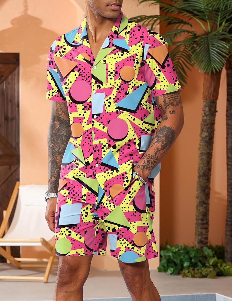 80s 90s Outfits For Men:Vintage shirts and shorts set disco beach outfit perfect for disco themed party, band concerts, birthday, rock and roll events,club, vacations,or casual outgoing etc.Vibrant and cool style make you more attractive and charming.