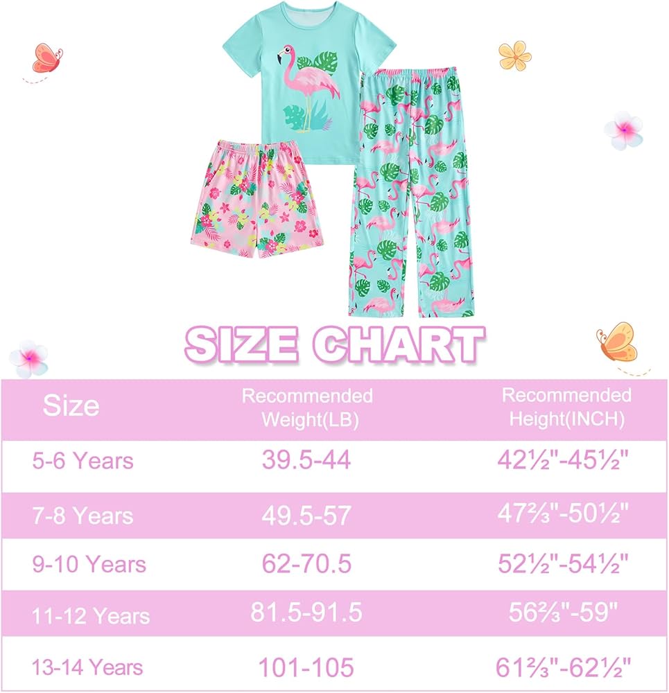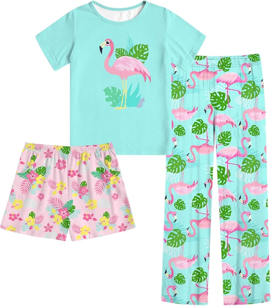 Versatile Sleepwear Set: This 3-piece pajama set is designed for girls aged 7-14, offering a sleepwear ensemble with a short-sleeved top, comfortable shorts, and cozy long pants.