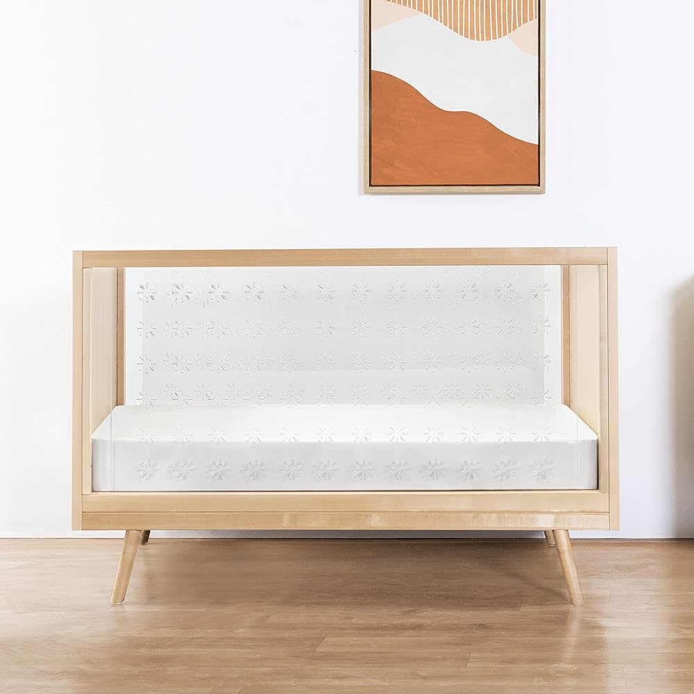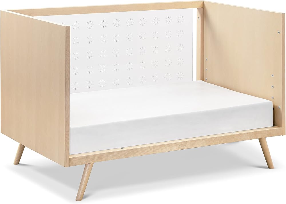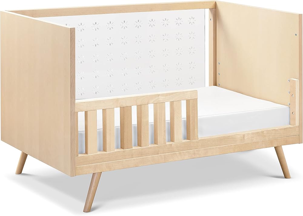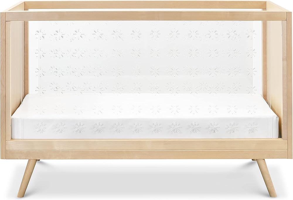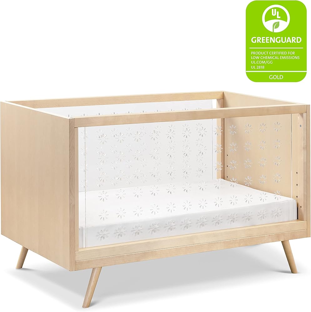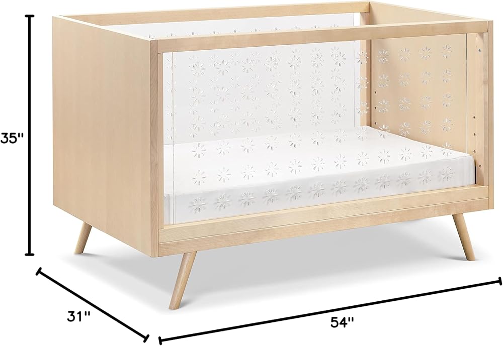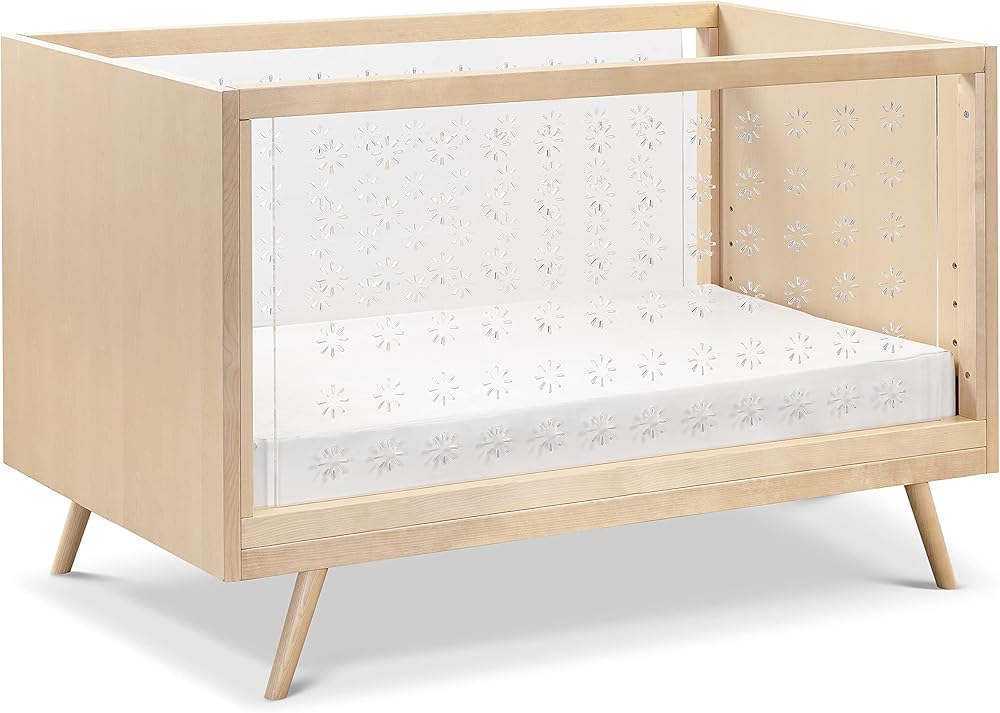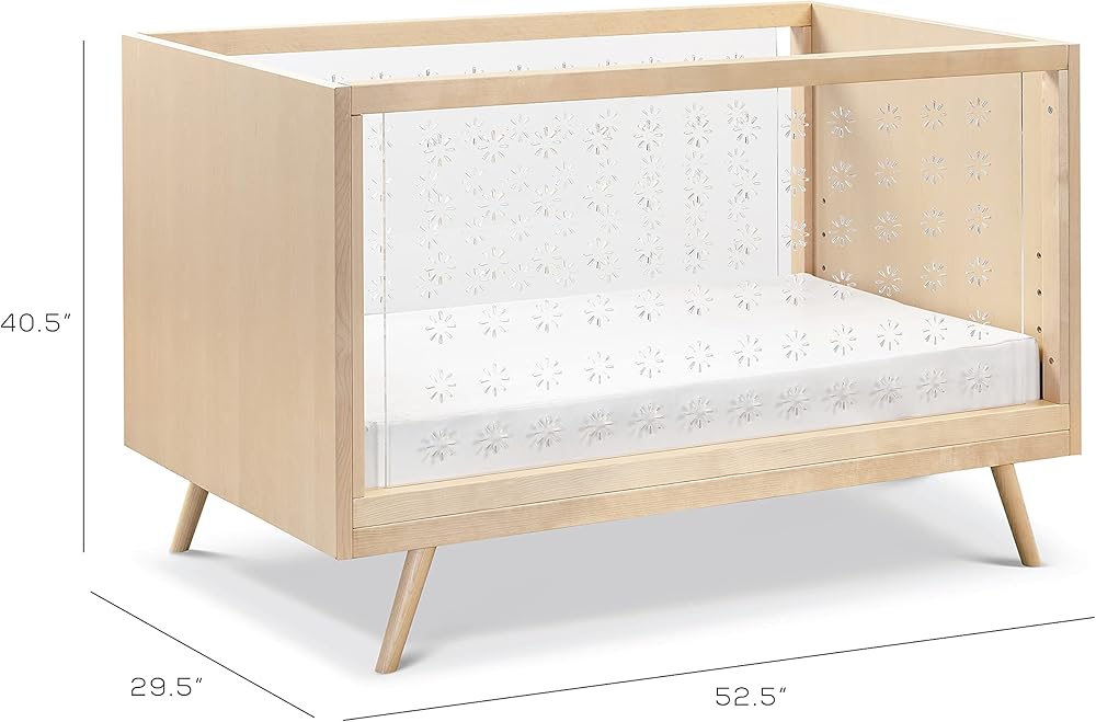 Nifty Clear Crib combines a mid-century aesthetic with contemporary clear acrylic sides, providing greater visibility for parents. It features four adjustable mattress positions and easily converts to a toddler bed (conversion kit sold separately).