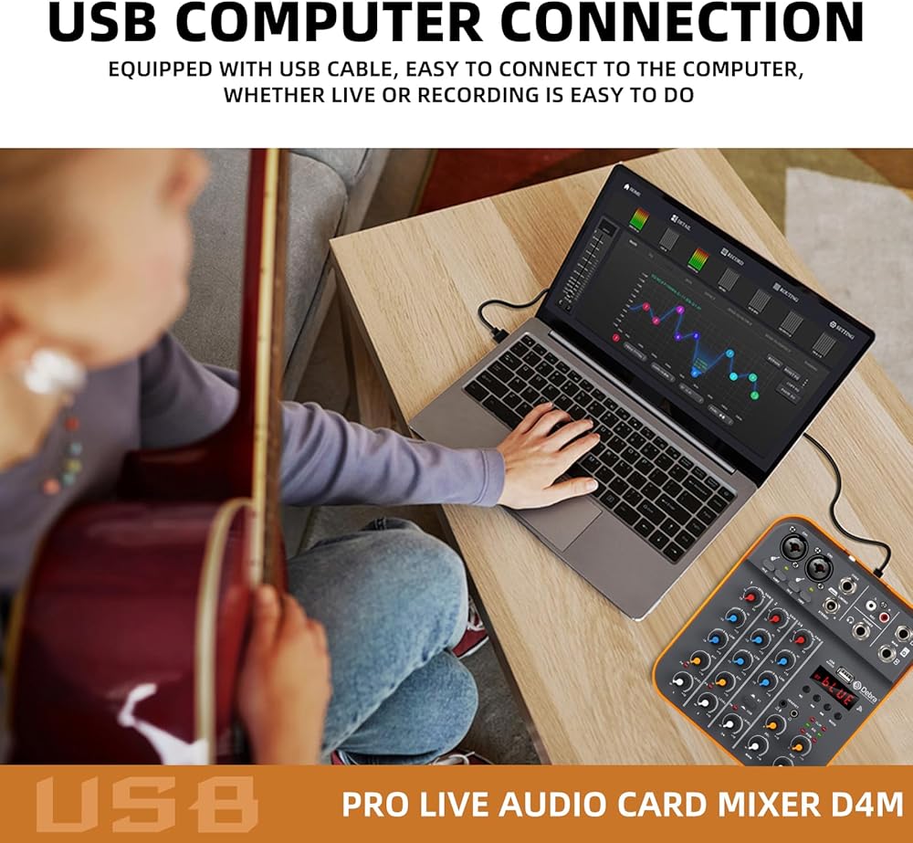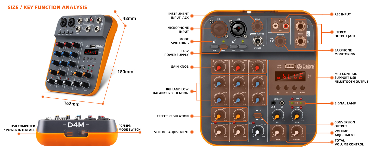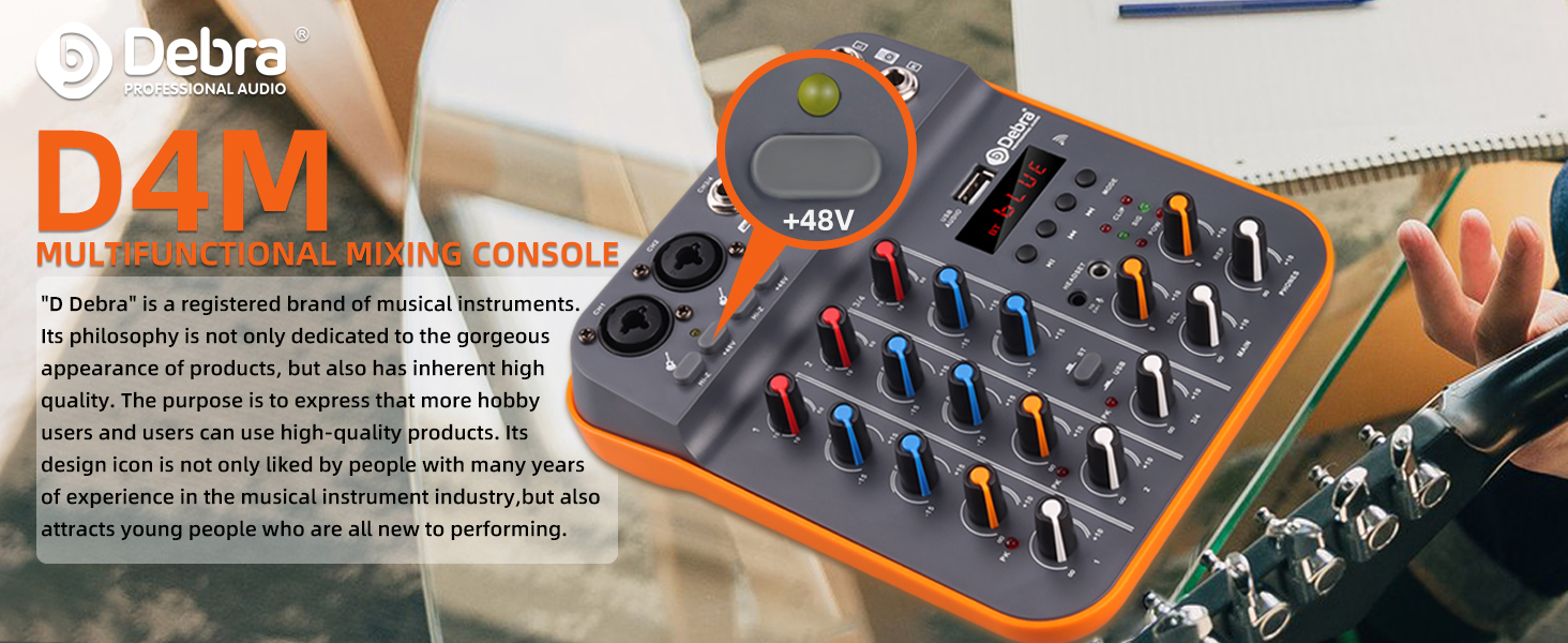 Audio Mixer D Debra Audio D4M Portable 4-Channel DJ Mixer Console, Sound Mixing Board with USB Bluetooth 48V Phantom Power, Audio Console for Live Wedding Party Recording Broadcast