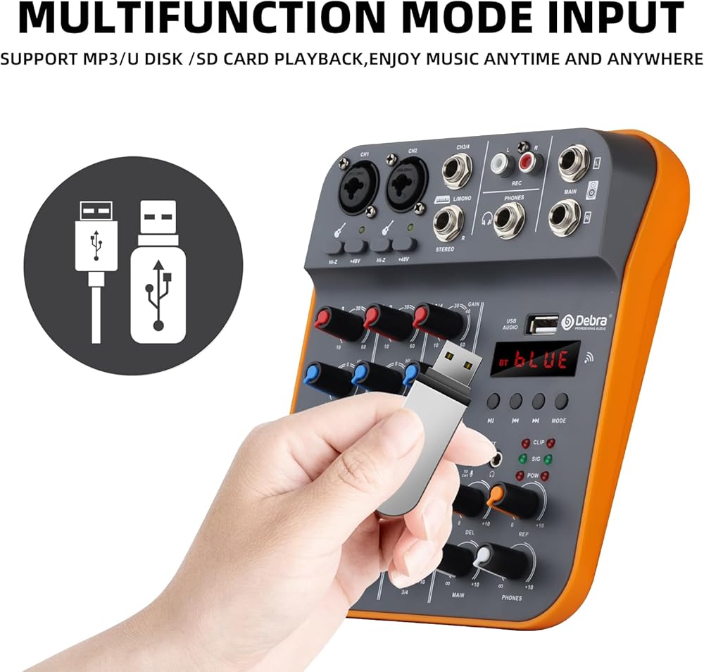 Stay connected effortlessly with our multifunctional mixer console. Utilize wireless Bluetooth for stable, lossless transmission, or connect via USB for seamless integration with your computer. With support for MP3, U disk, and SD card playback, you can enjoy your favorite tunes anytime, anywhere.