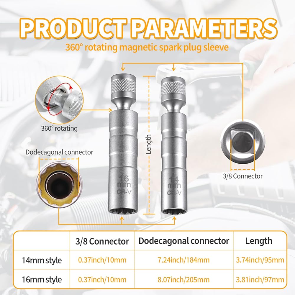 【Versatile Size Options】: Offering two sizes, 14mm and 16mm, with respective outer diameters of 19mm and 21mm, and a length of about 3.8 inches, these spark plug sockets are universally compatible with most car models. Choose according to your needs.