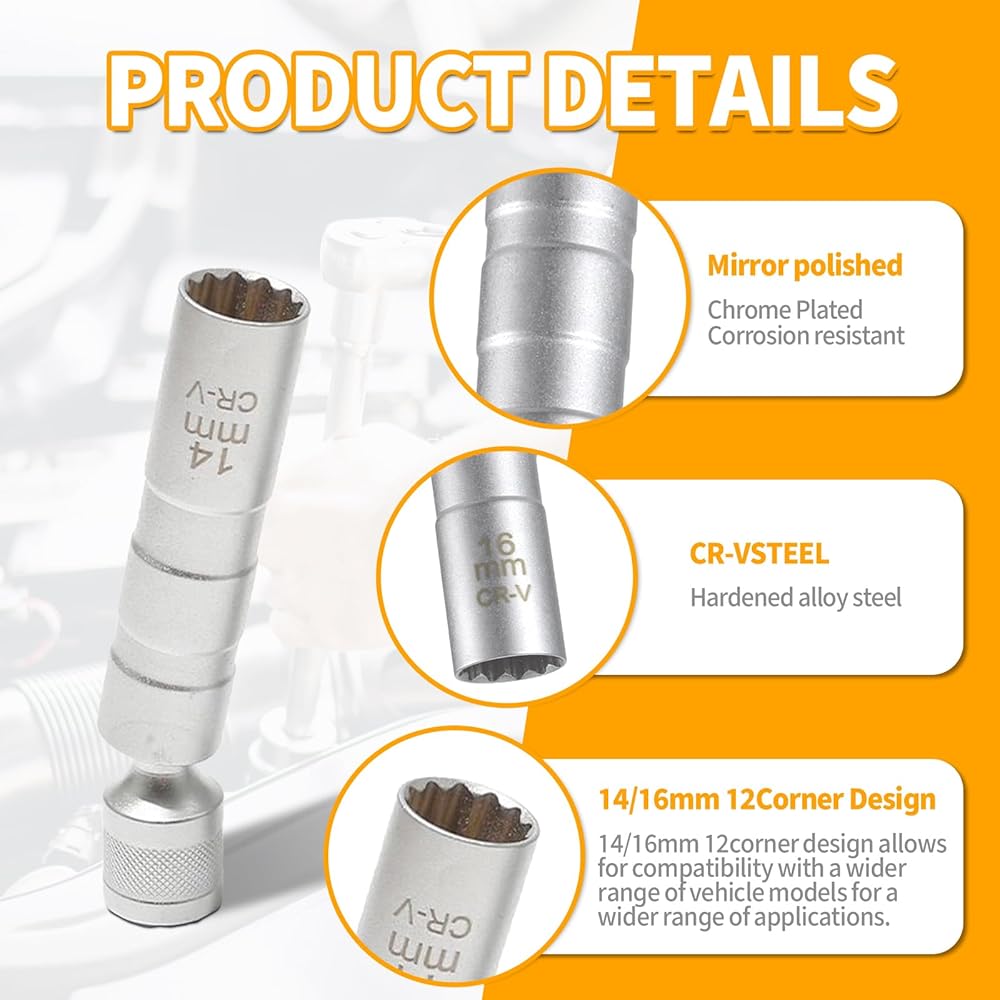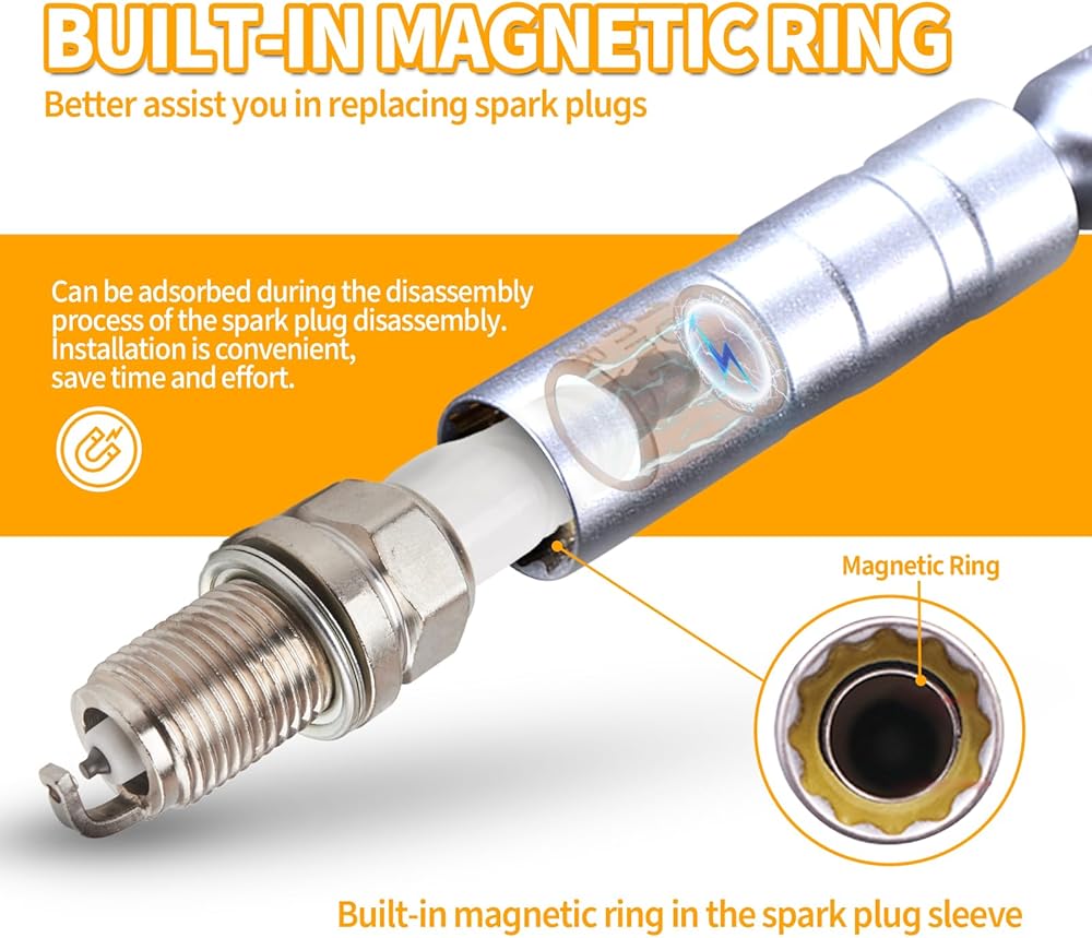 【Magnetic Adsorption】: The built-in strong magnet in the spark plug socket ensures a firm hold on the spark plug, preventing loosening and falling during installation and removal. This powerful grip makes your work more efficient, eliminating the hassle of searching for spark plugs.