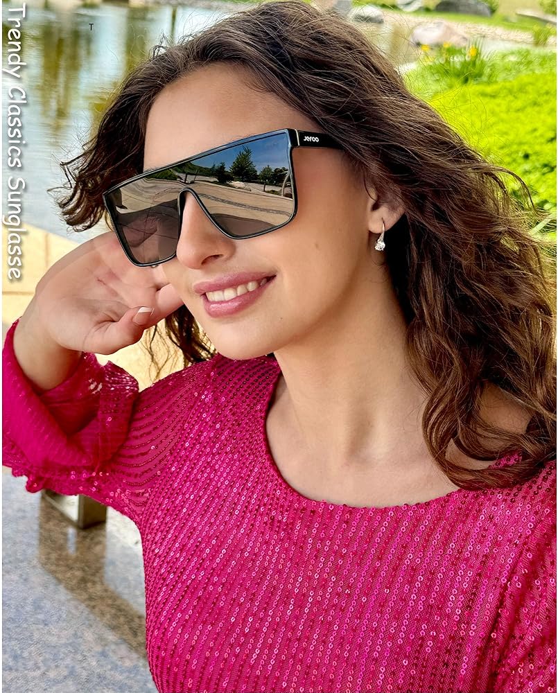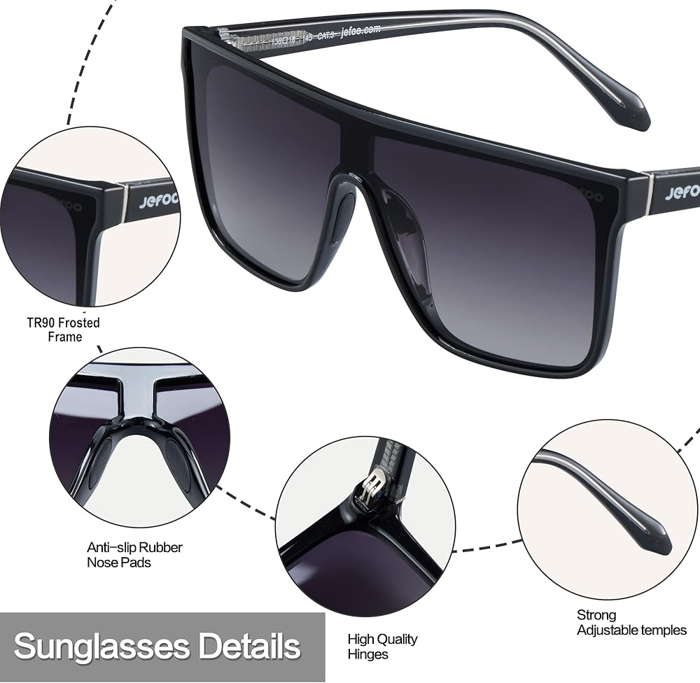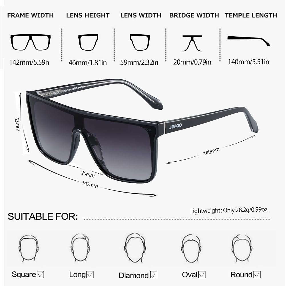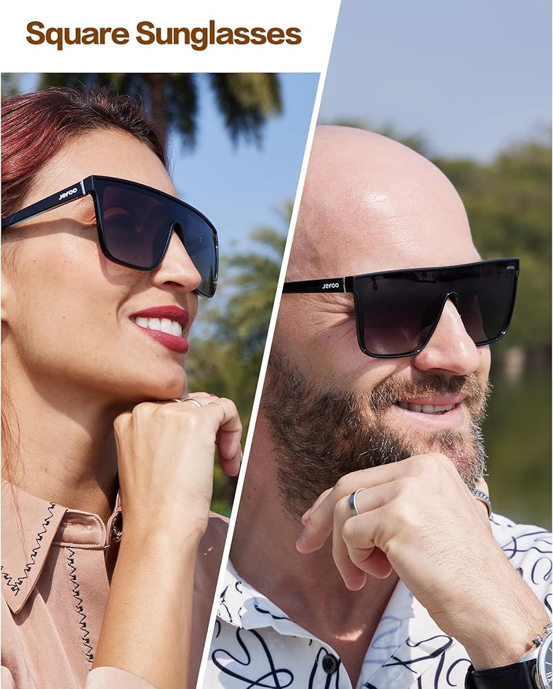 Square Flat Lens Design: Jefoo stylish sunglasses, with integrated square lenses, are suitable for both men and women. The large square frame complements various face shapes, showcasing your elegance and fashion sense. The unique flat top design perfectly shades your eyes.