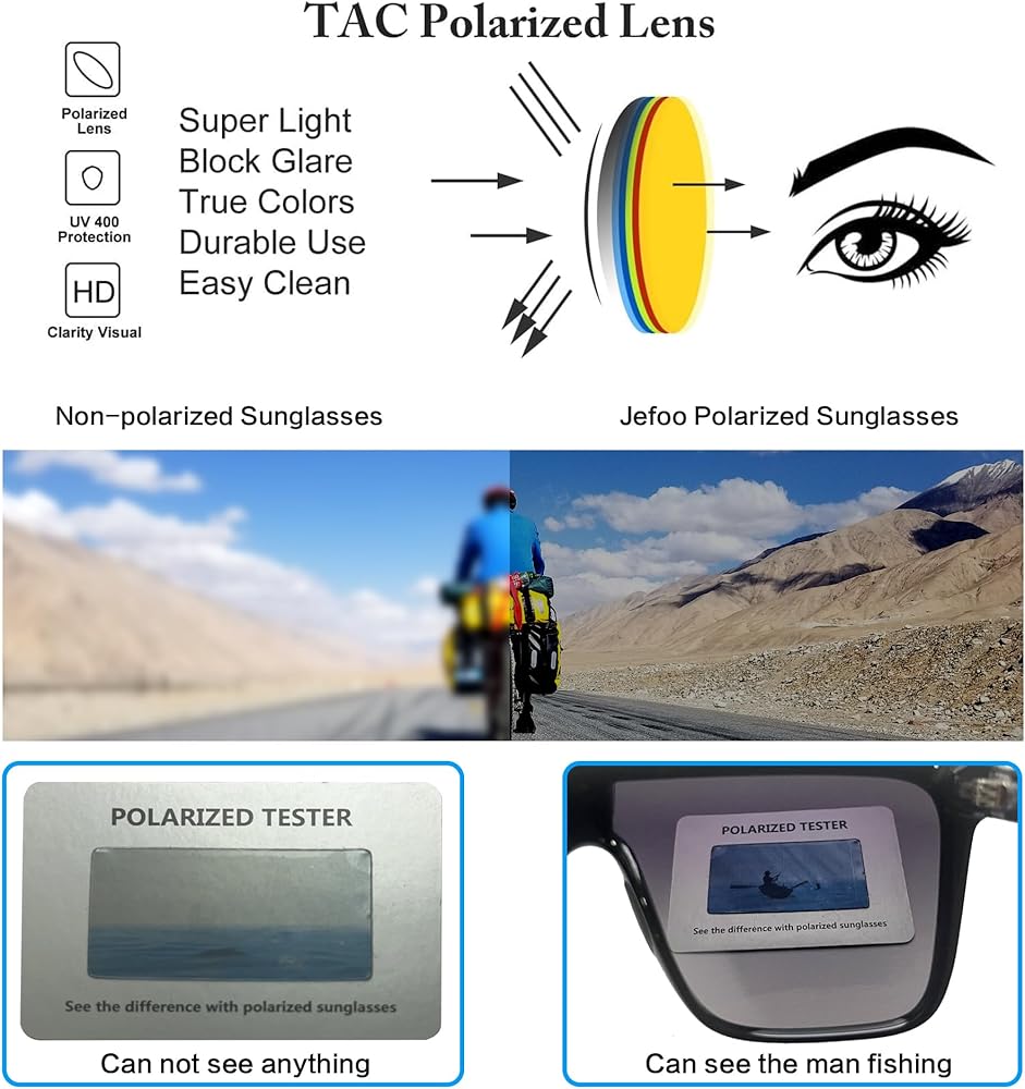 Perfect Polarized Sunglasses: Jefoo polarized sunglasses lenses have a UV400 protective coating, effectively blocking UVA, UVB, and UVC rays that can harm your eyes. The polarized design keeps your eyes unhindered in bright light, allowing you to enjoy the sunshine.