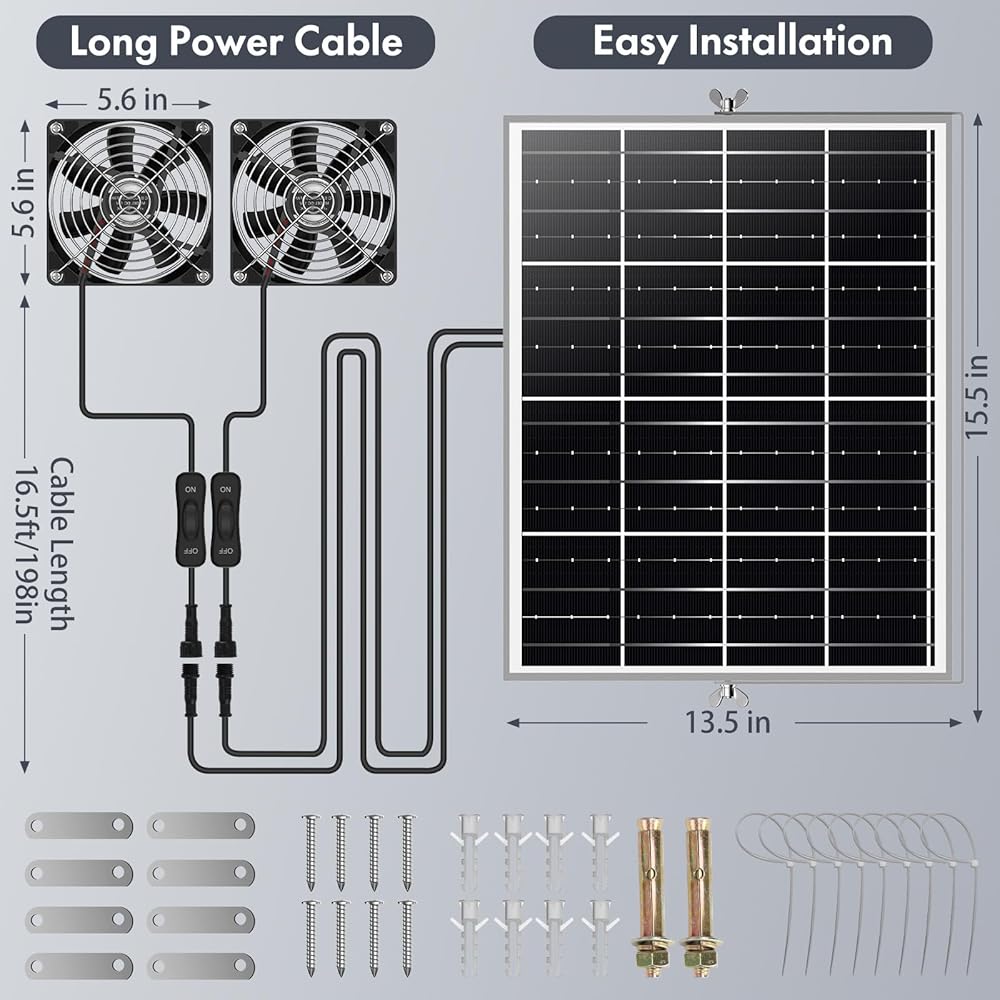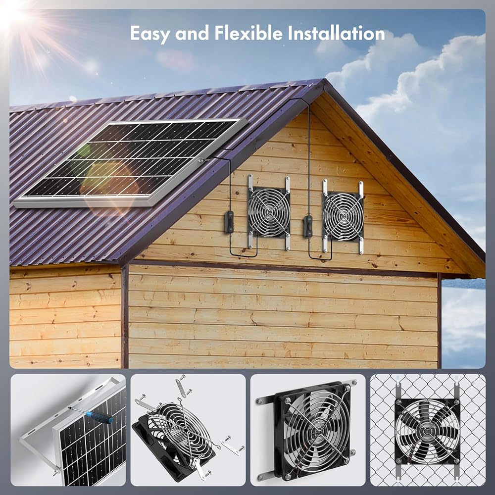 【Easy Installation】 The package has mounting hardware for swift installation. Simply create an opening in the wall or glass, position the solar panel in optimal sunlight exposure, and secure the fans to the opening.