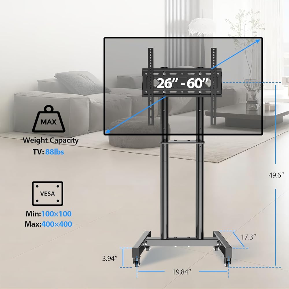 Mobile TV Cart for 26"-60" 4K LCD LED TVs & Monitors,Rolling TV Stand Max VESA 400x400mm,Holds up to 88 Lbs,32 37 39 40 42 43 50 55 58 inch Mobile TV Trolley,Floor standing TV mobile bracket