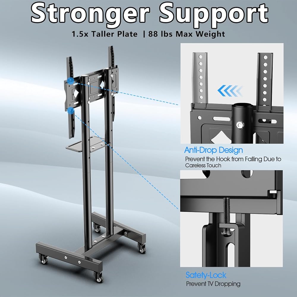【Two Columns Design】Mobile TV stand mount support column adopts two columns support design, which is a great improvement in stability, so that you won't shake when you move your TV.