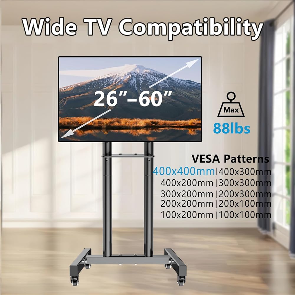 【Uuiversal Mobile TV Stand】This TV mobile stand is widely compatible with 26-60 inch LED,LED,OLED,4K TVs and monitors,TV stand VESA(mounting hole pattern):100x100mm/200x200mm/200x100mm/300x300mm/300x200mm/400x400mm/400x300mm/400x200mm