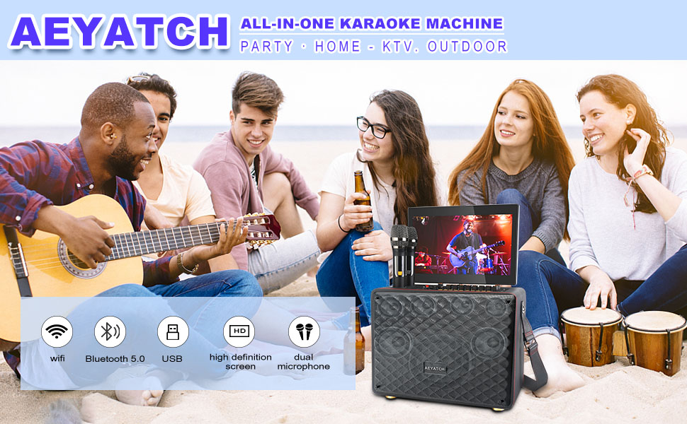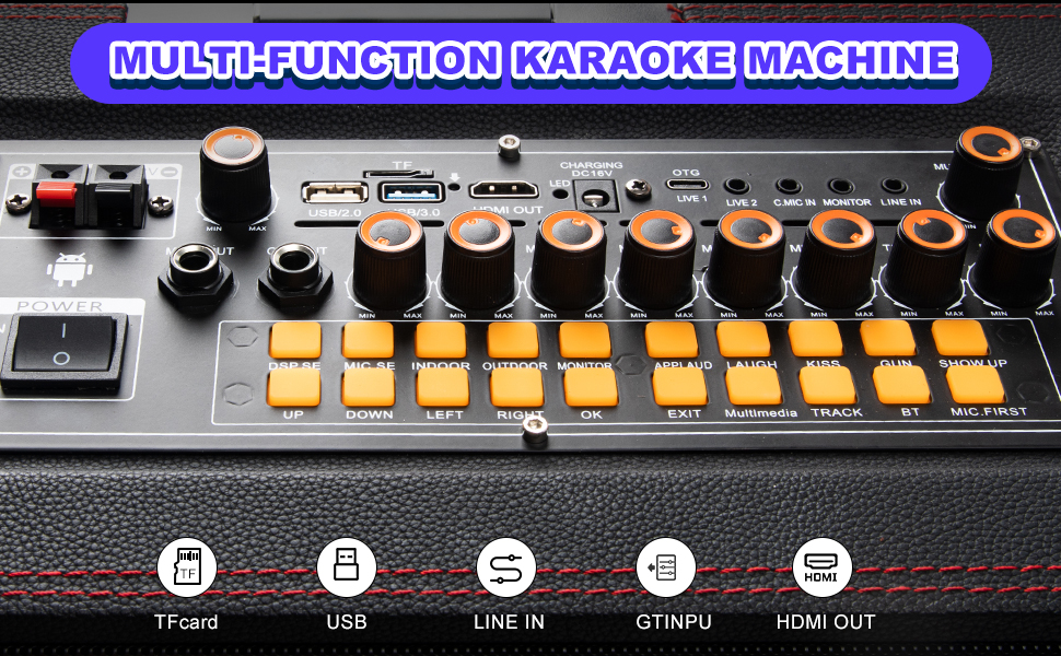 【آلة كاريوكي متعددة الوظائف】- آلة كاريوكي للبالغين والأطفال اختر من بين 7 أوضاع تشغيل، جهاز لوحي، بلوتوث، USB، مخرج AUX، Micro-SD، HDMI (يمكن الإخراج إلى التلفزيون، جهاز العرض)، Live Mobile (Tiktok)، 2 قابلان لإعادة الشحن تحتوي الميكروفونات اللاسلكية للأطفال والكبار على شاشات عرض منفصلة؛ اضبط مستوى صوت الميكروفون والصدى والمعادل للتحكم المثالي في نغمة الكاريوكي