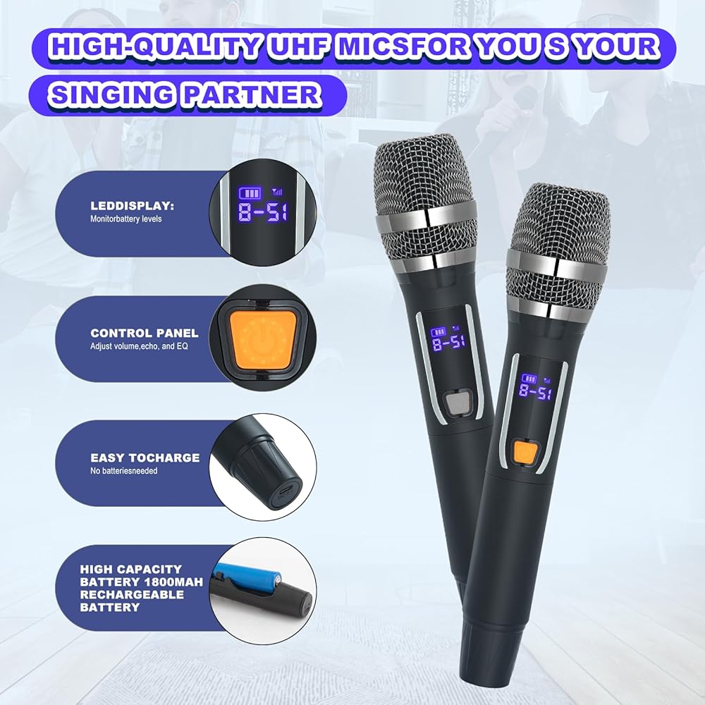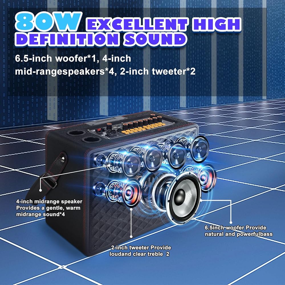 【جودة صوت لا مثيل لها】- آلة الكاريوكي مجهزة بمكبر صوت كامل التردد مقاس 6.5 بوصة * مكبرات صوت متوسطة المدى مقاس 1 بوصة * 4، ومكبر صوت مقاس 2 بوصة * 2، تعتمد تقنية فصل صوت الجير العالية والمنخفضة المتقدمة للحصول على وضوح كريستالي صوت، وجهير أقوى، وحجم أكثر اعتدالًا، ويزيل كل الضوضاء. لا يشوه ميكروفون الكاريوكي الصوت حتى عند مستويات الصوت الأعلى، مما يوفر موسيقى مذهلة وأجواء رائعة لحفلتك.