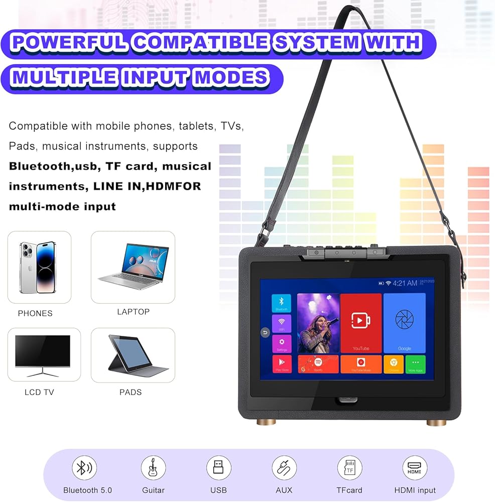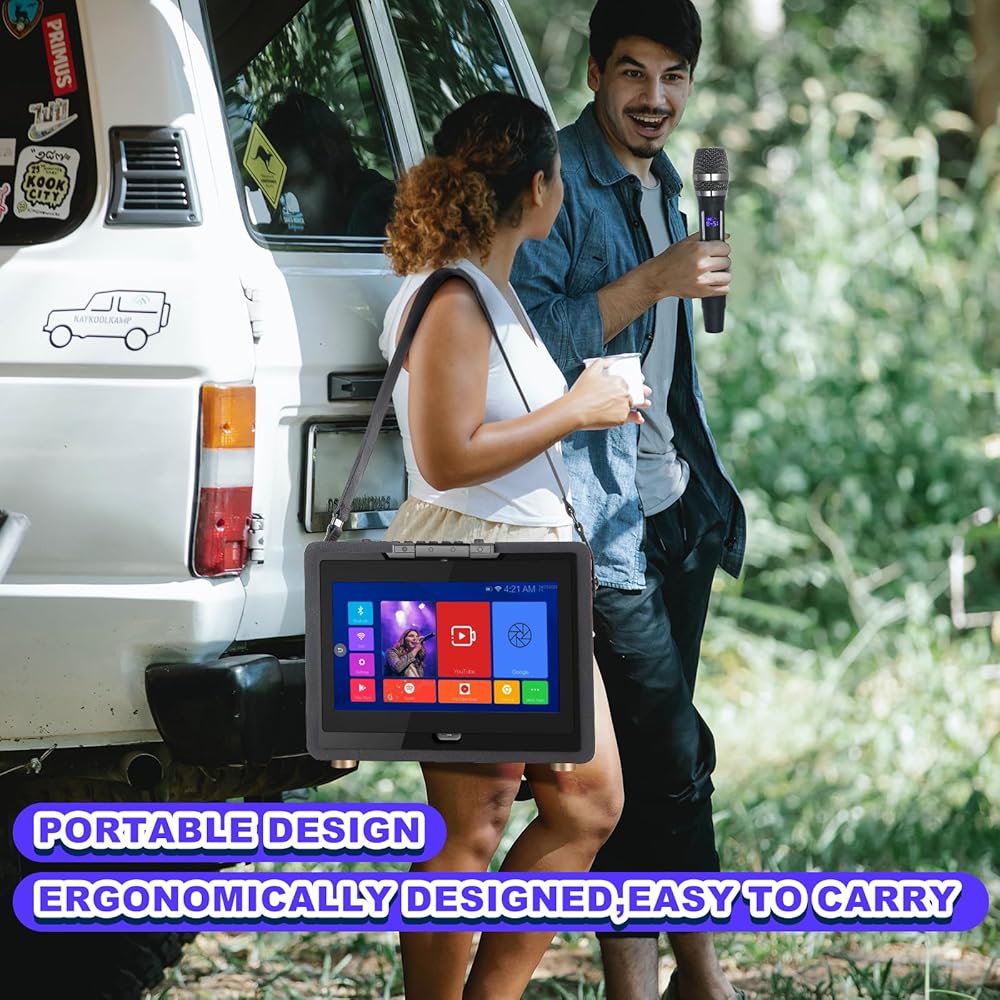 أفضل آلة كاريوكي محمولة - آلة الكاريوكي مع عرض الكلمات تنتقل عن طريق حزام الحمل، بينما يتم تثبيت الجهاز اللوحي في مكانه من أجل النقل الآمن. بطارية قابلة لإعادة الشحن تدوم 8 ساعات في آلة الكاريوكي المزودة بشاشة مما يعني أنه يمكنك الاستمتاع بمعركتك في أي مكان.