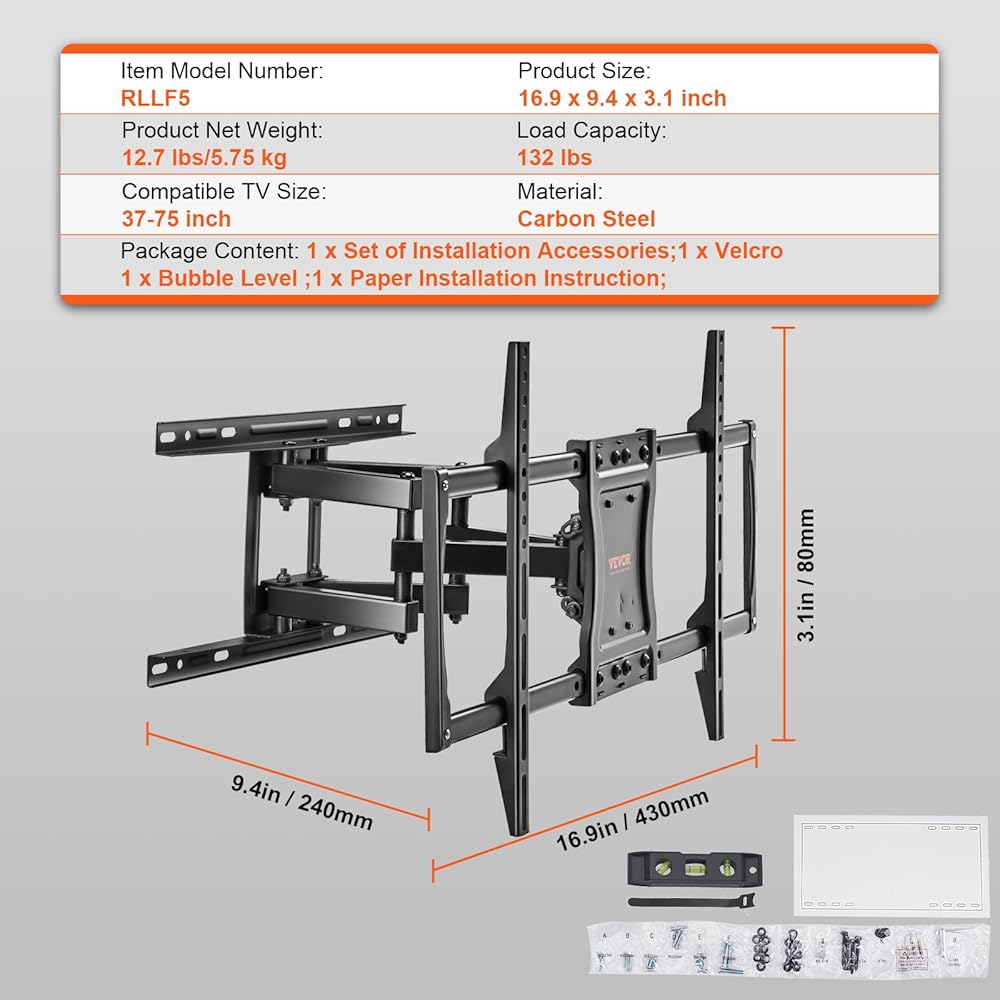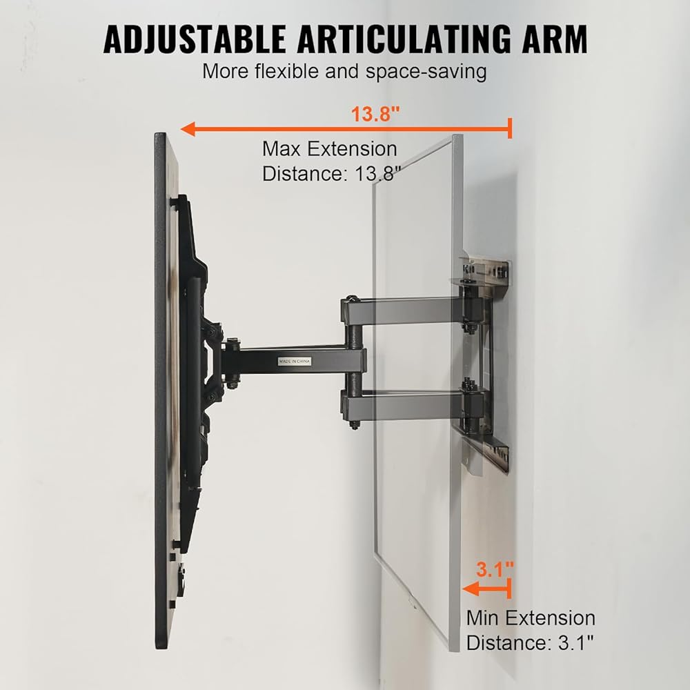 Space-saving Design: VEVOR articulating TV mount allows it to be adjusted from 2.4"/6 cm to 19.3"/49 cm away from the wall, saving valuable space in your room. We also provide Velcro for convenient cable management, keeping everything tidy and organized.
