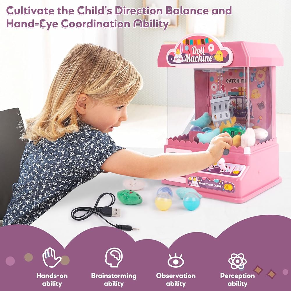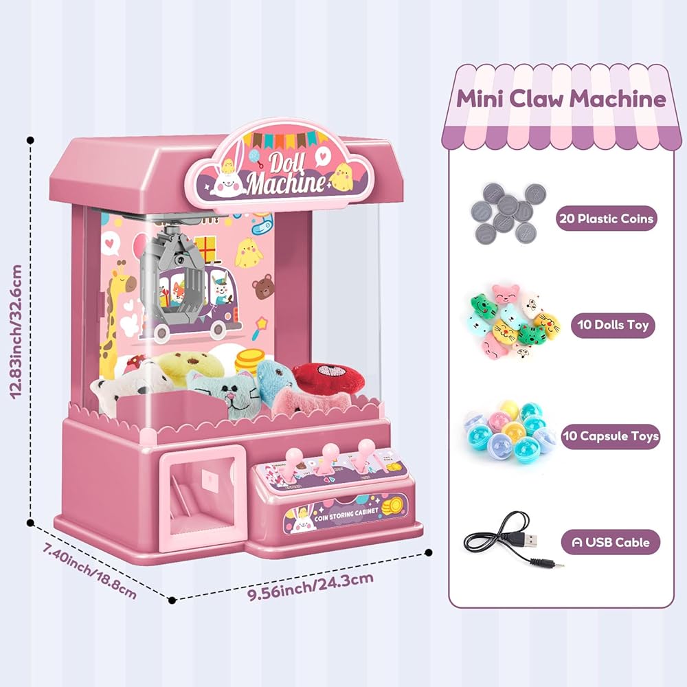 【Packge List】Our claw machine comes with exquisite accessories—1 mini claw machine, 20 plastic coins, 10 dolls toy, 10 capsule toys and 1 USB cable. Rich accessories to meet children's entertainment needs!