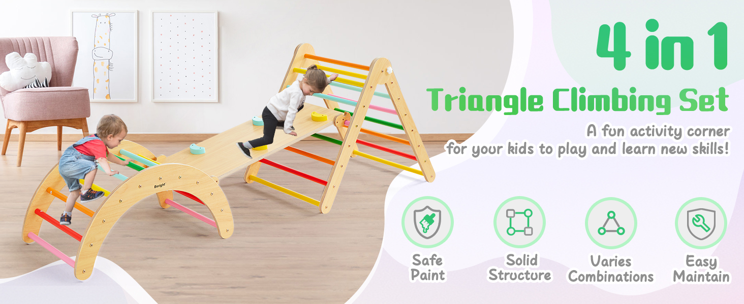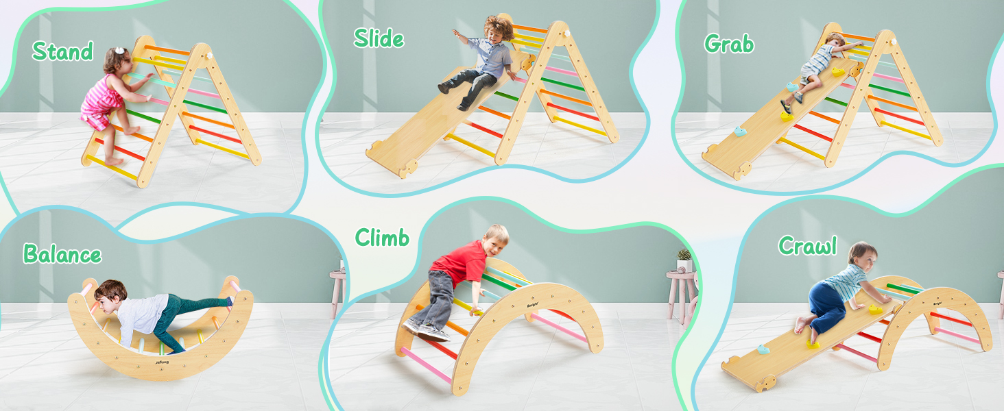 【UPGRADED 4-IN-1 CLIMBING ARCH】Our climbing toy has standard set of three parts, according to the traditional pikler triangle gym game. It can become a slide, climbing arch, racking arch or anything you can imagine. Kids will have a lot of fun with the climbing set. Besides, our triangle gym is fully compliant with Montessori teaching principles, which helps kids improve their skills of balance, build their body and mind.