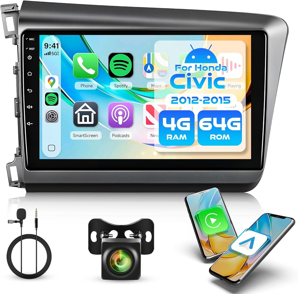 Rimoody 4G+64G Android Car Stereo for Honda Civic 2012-2015 with Wireless Carplay Android Auto Radio, 9'' Touchscreen Head Unit with GPS Navigation Bluetooth5.0 5G-WiFi FM/RDS 32EQ Backup Camera SWC