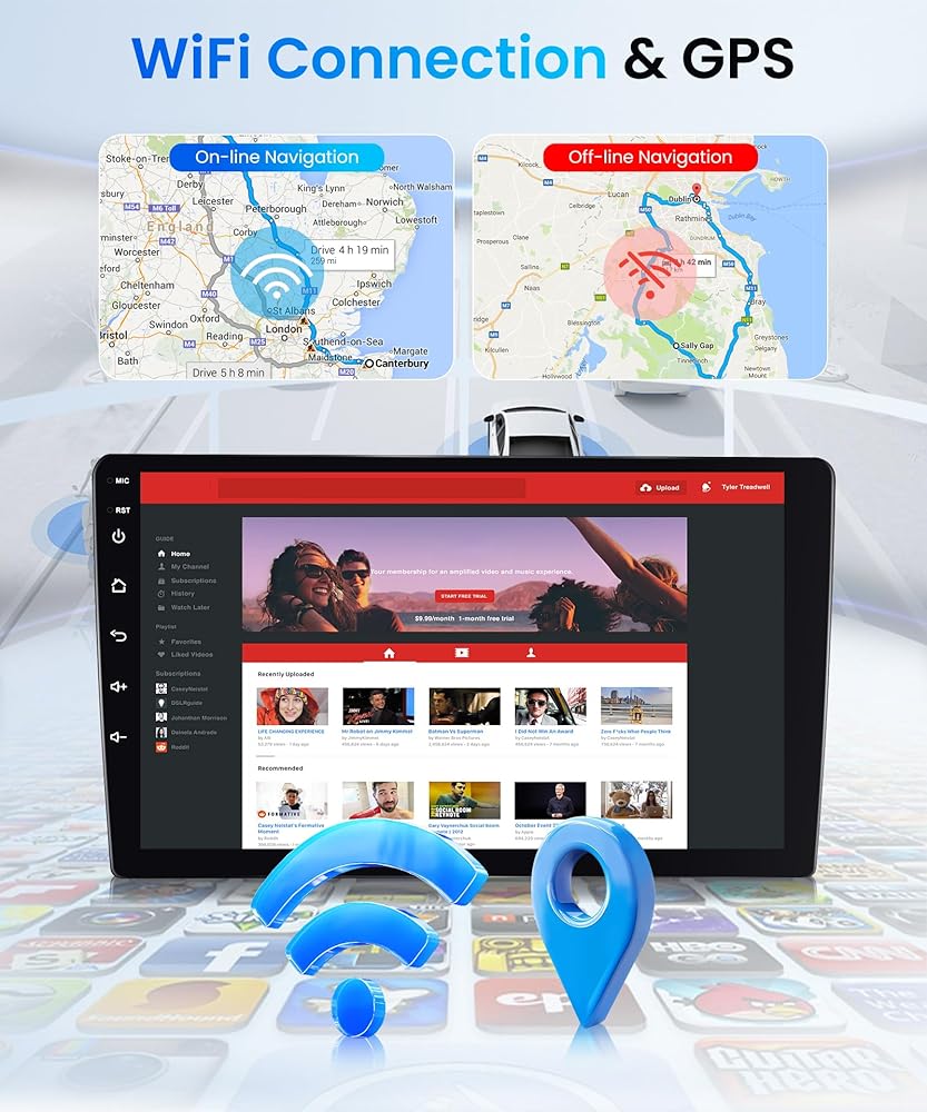 【Wireless Apple CarPlay /Android Auto&Mirror Link】You can easily gain access to your phone contacts, ,messages,emails, notifications, map navigation, music and more through Apple CarPlay/Android Auto. Connect your smartphone to the device via a USB cable or WIFI, and mirror your phone's screen on the device's display. You can use your phone's apps, music, videos, and more on the device.