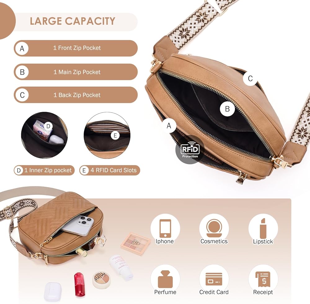 【Lightweight & Wide Guitar Strap】Roulens quilted crossbody bags has 1 Main zip pocket (with 1 x interior zipper pocket). External with 1 back zip pocket,1 front zip pocket. 4 RFID card slots suitable for credit cards,ID,Driver's License..Measuring 8.7"L*6.3"H*2.6"W. Comes with a detachable and adjustable long guitar strap (33.5" to 52" height).