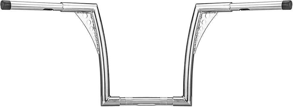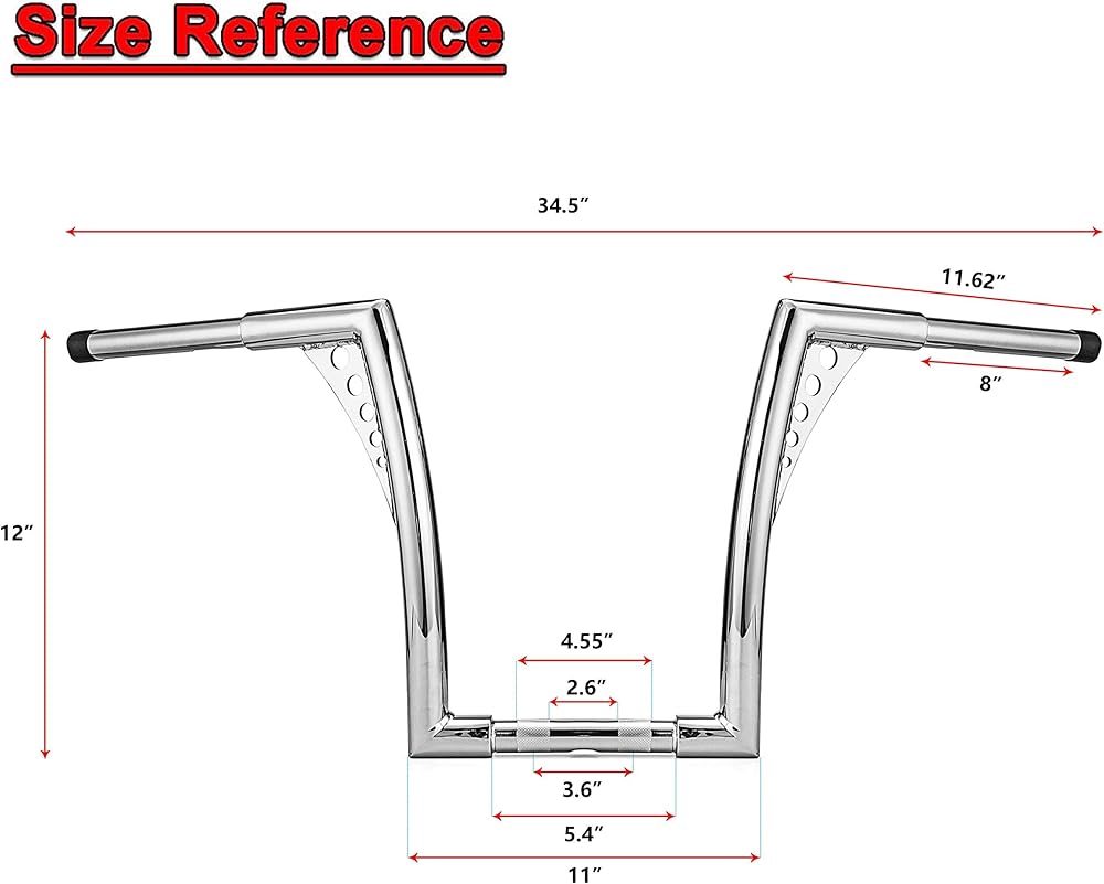 Handle Bar Specifications: Bar Diameter: 1-1/4 inch. Center Width: 10-1/2 inch.Clamp Area Width: 5.37 inch & Diameter: 1 inch. Grip Area Bar Diameter: 1 inch. Pre-Drilled: Yes. End Rise: 12 inch. Model: Monkey Bagger Bar. Overall Width: 35.5 inch. Pullback/Sweep: 8 inch. Knurling Inside Width: 2.5". Outside Width: 4.5".