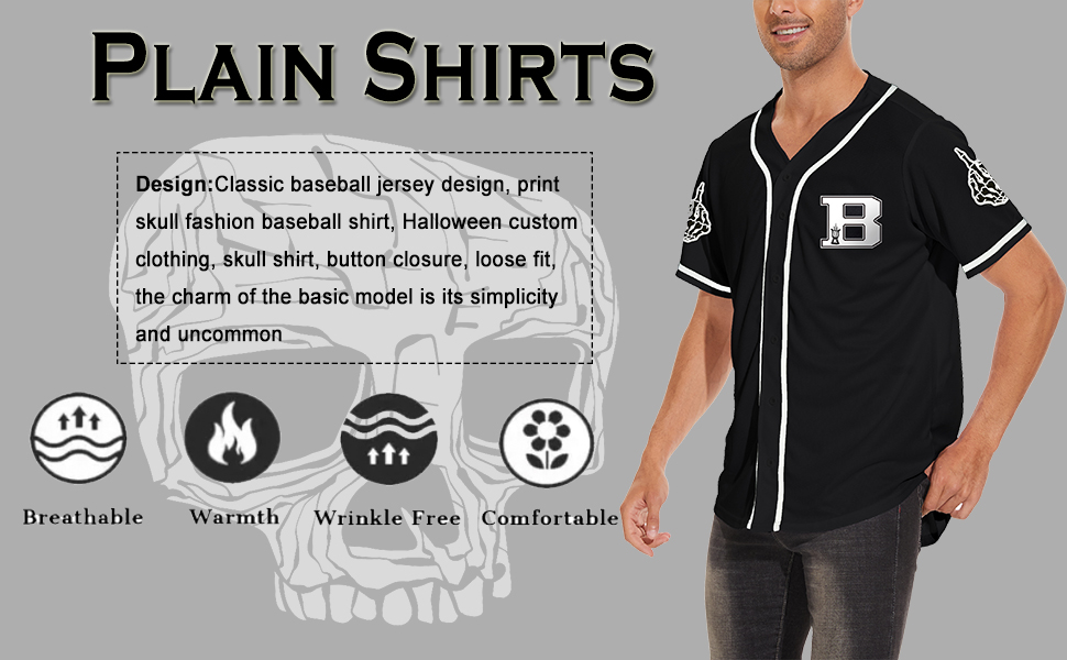【Classic Design】:men plain baseball jerseys use button and line design. men jersey has letter print on the chest , cuffs with skulls pattern,simple and vintage, classic and fashion