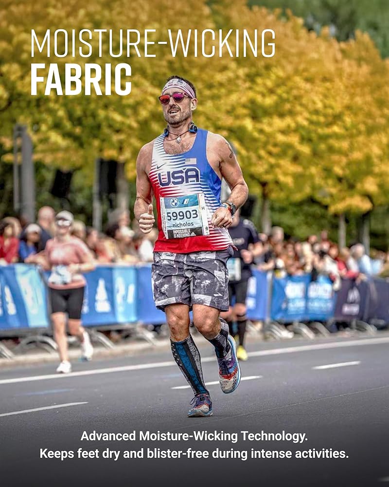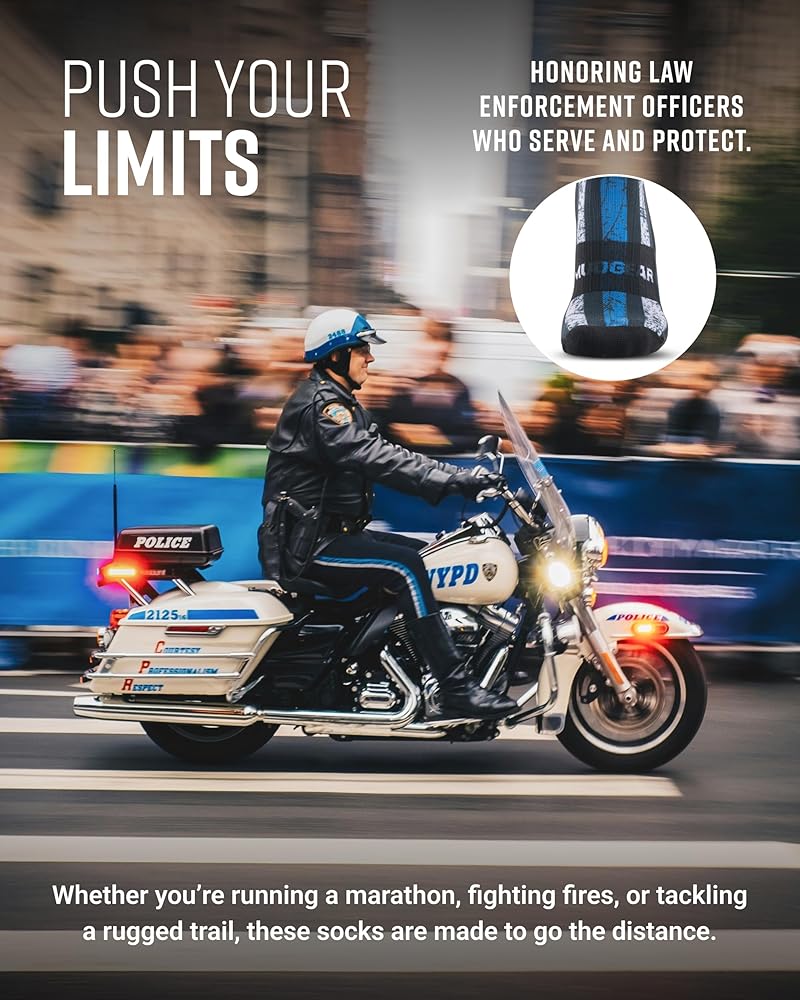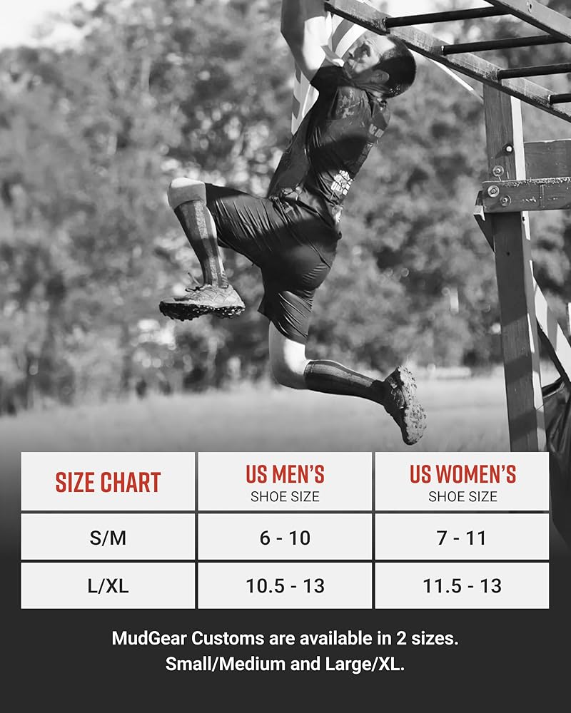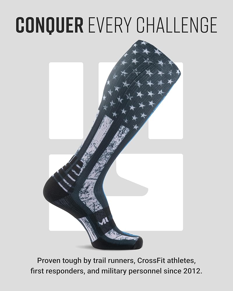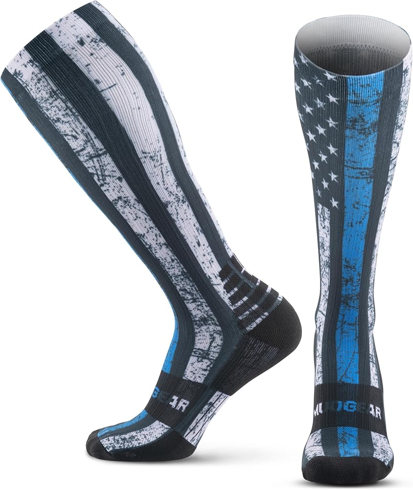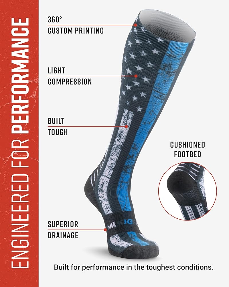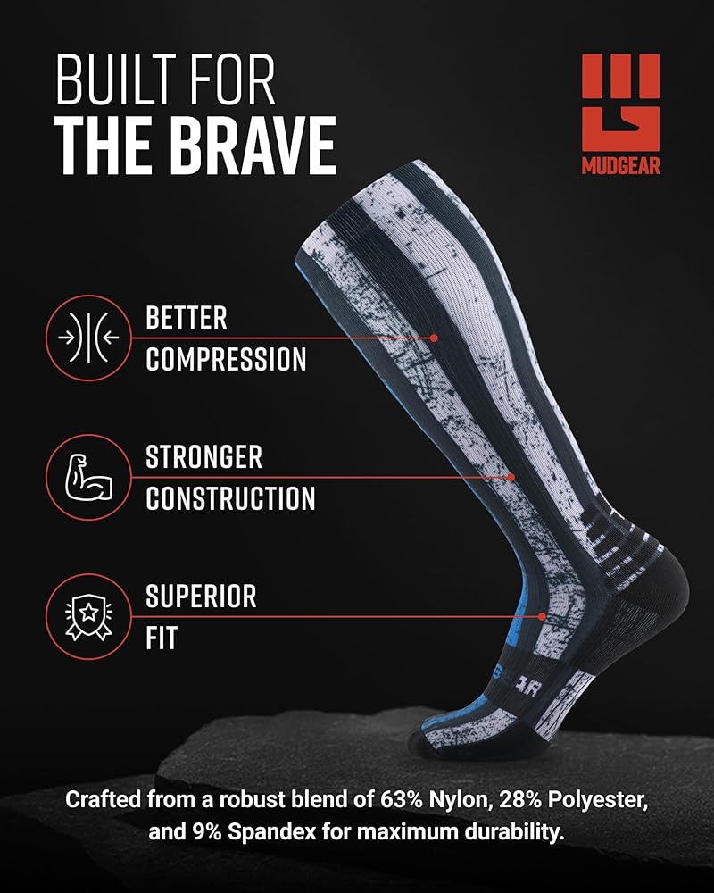 When the job demands toughness, your gear better keep up. Whether you're chasing down a finish line or answering the call, the MudGear Custom First Responder Compression Socks for men and women deliver the durability, support, and all-day comfort you need. Designed for first responders, endurance athletes, and anyone who grinds through long hours on their feet, these socks feature light compression for better circulation, reduced fatigue, and a no-slip fit that won't quit before you do. Built from 63% Nylon, 28% Polyester, and 9% Spandex, our rugged yarn blend is made to withstand the harshest conditions—trail running, mountain biking, obstacle races, and nonstop shifts. The sweat-resistant fabric pulls sweat away, keeping your feet dry and blister-free, while ventilated panels prevent overheating. True compression helps fight swelling and soreness, making these socks just as effective for post-workout recovery or long flights as they are for race day. Choose from three bold designs that make a statement: the Thin Blue Line, honoring police officers who protect and serve; the Thin Red Line, recognizing the bravery of firefighters; and the American Eagle, a tribute to freedom and the strength of those who defend it. Each 360° printed design stands out while maintaining the premium performance MudGear is known for. Battle-tested by first responders, endurance athletes, and outdoor warriors since 2012. We stand behind our gear with a 100% satisfaction guarantee because when you're built to perform, your gear should be too.