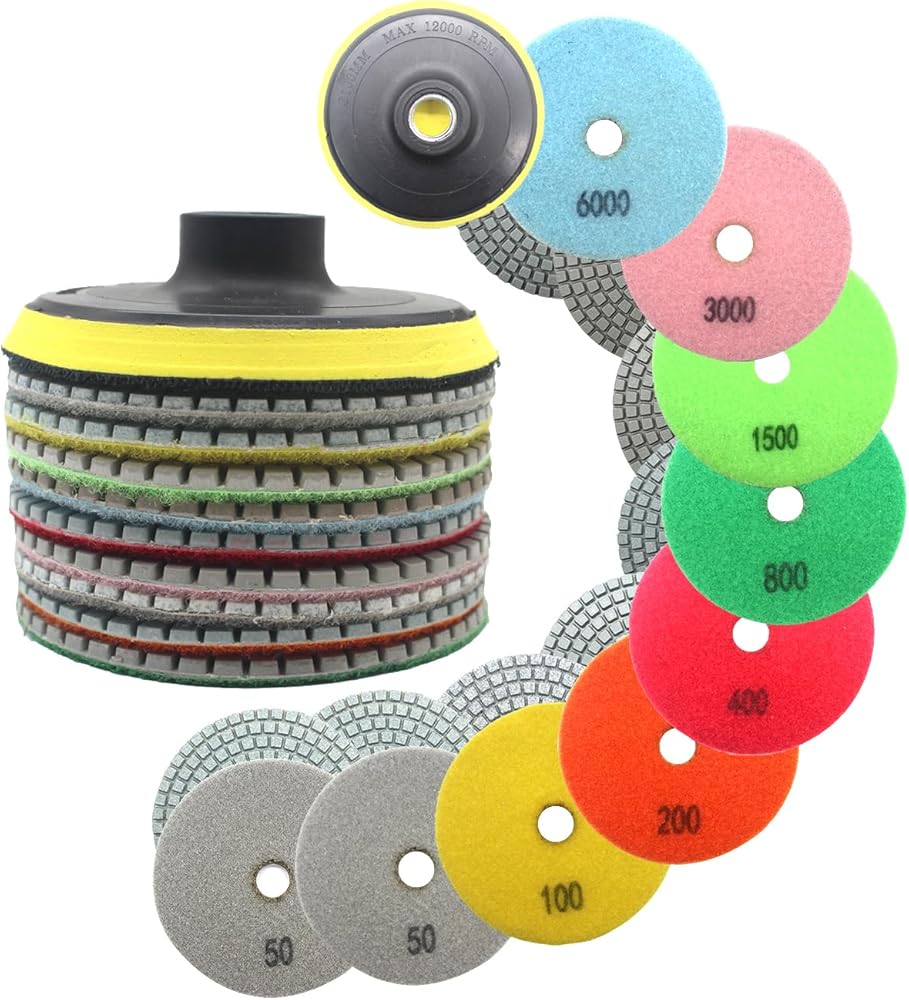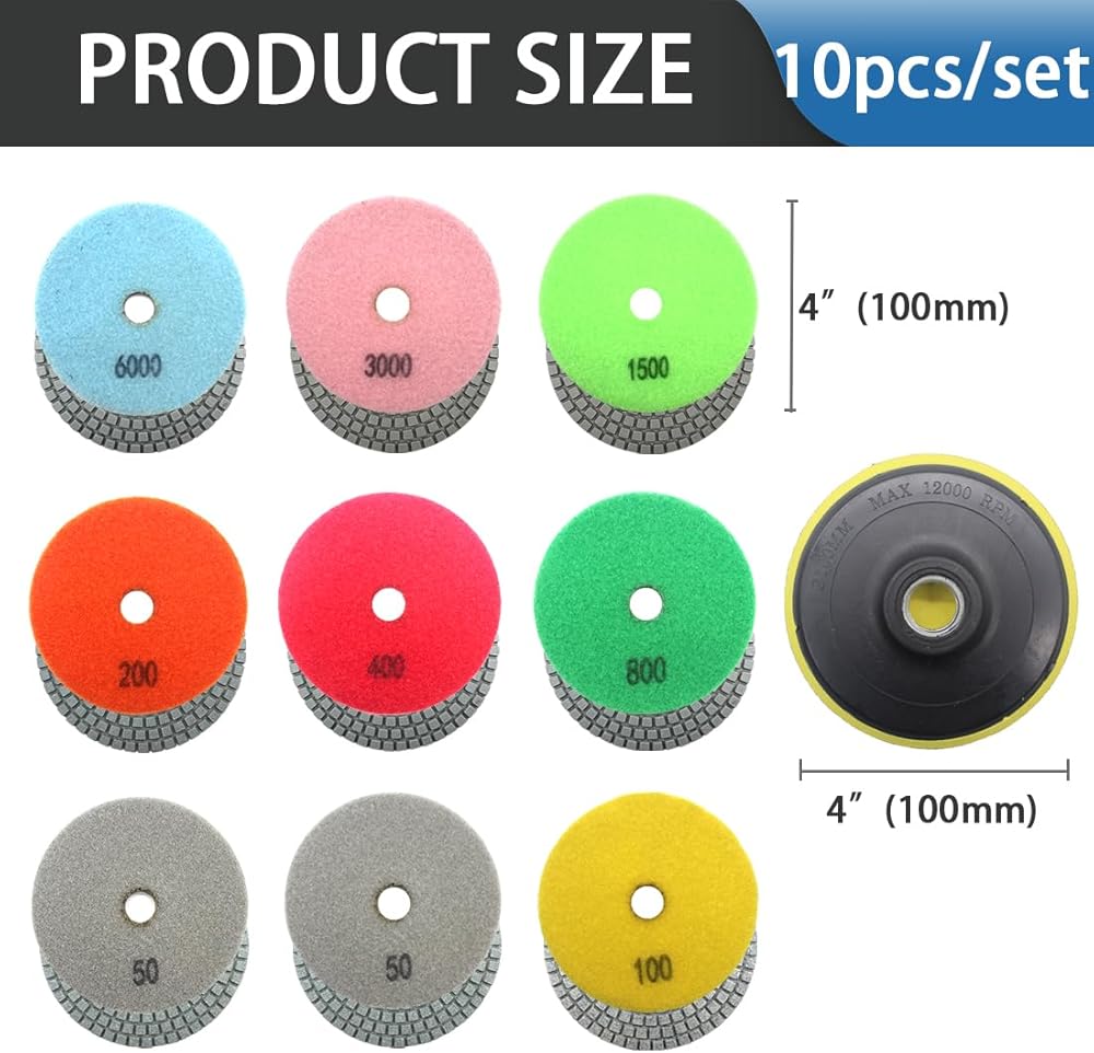 【Package Includes】: 4" Wet Diamond Polishing Pads 10 Pieces(2pcs Grit 50,1pc of each Grit 100 200 400 800 1500 3000 6000) Plus 1 Piece Hook and Loop Backer Pads, total 10 pieces/Pack, economical choice