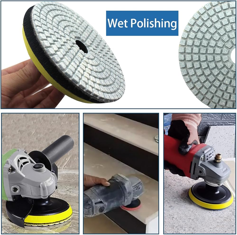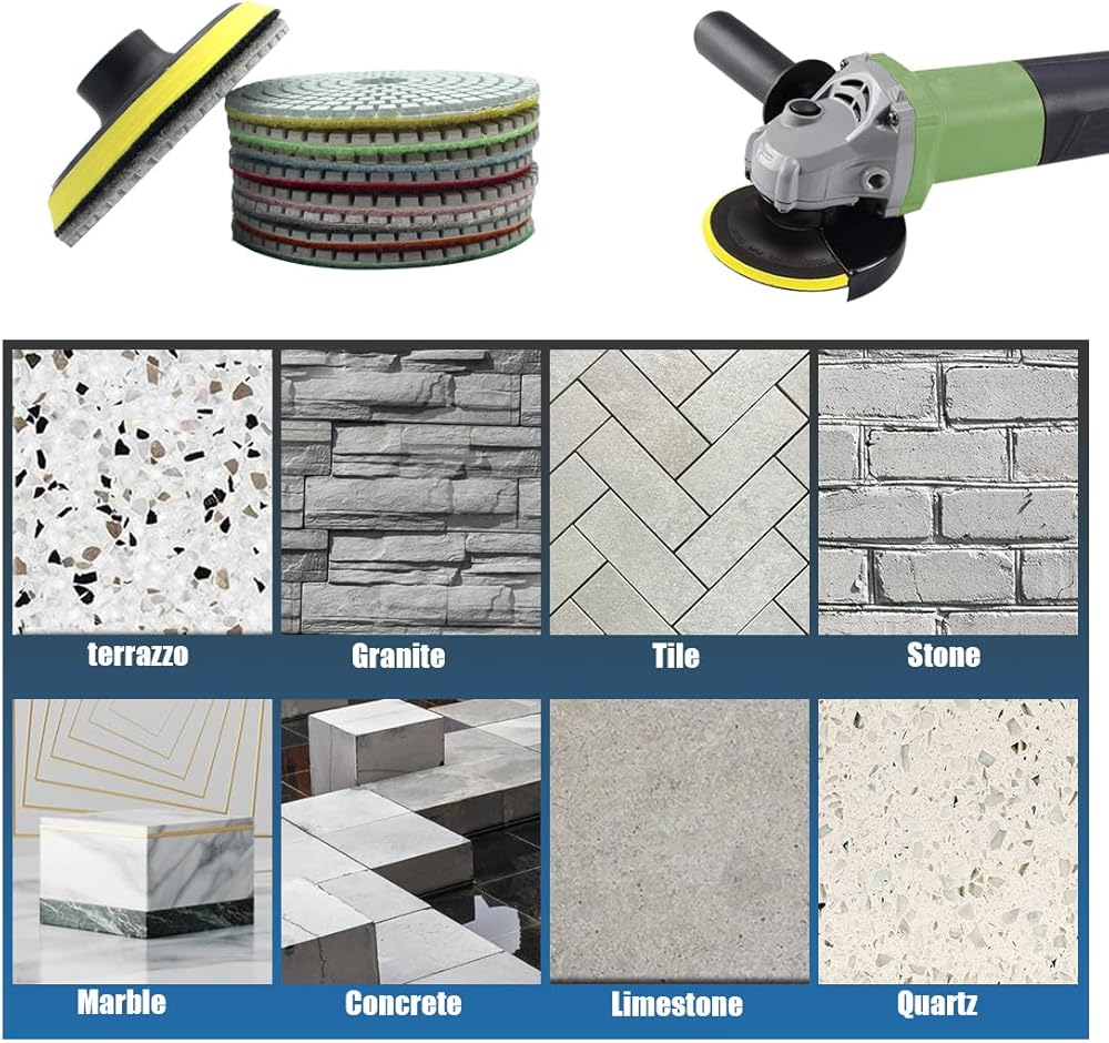 【Wide Application】: 4" diamond polishing pad kit is great for all solid surface materials. Perfect for wet polishing granite marble ceramic quartz terrazzo artifical stone, glazed tiles, vitrified tiles,glass and concrete countertop.etc.convenient and less pollution