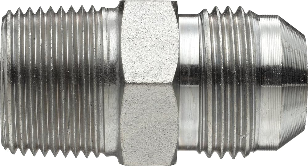The Brennan 2404 series MJ-MP adapter fitting is made of steel and has JIC male and NPTF male connectors. This adapter fitting connects pipes or fittings with different end types, diameters, or materials. It has a Joint Industrial Council (JIC) flared male connector on one end and a National Pipe Taper Fuel (NPTF) male connector on the other. The fitting is made of steel for its better weldability and increased rust resistance over iron. The working pressure for this fitting is up to 5000 pounds per square inch (psi), and its operating temperature ranges from -63 to 400 degrees F. This tube fitting meets Society of Automotive Engineers (SAE) standard J514 for quality assurance.