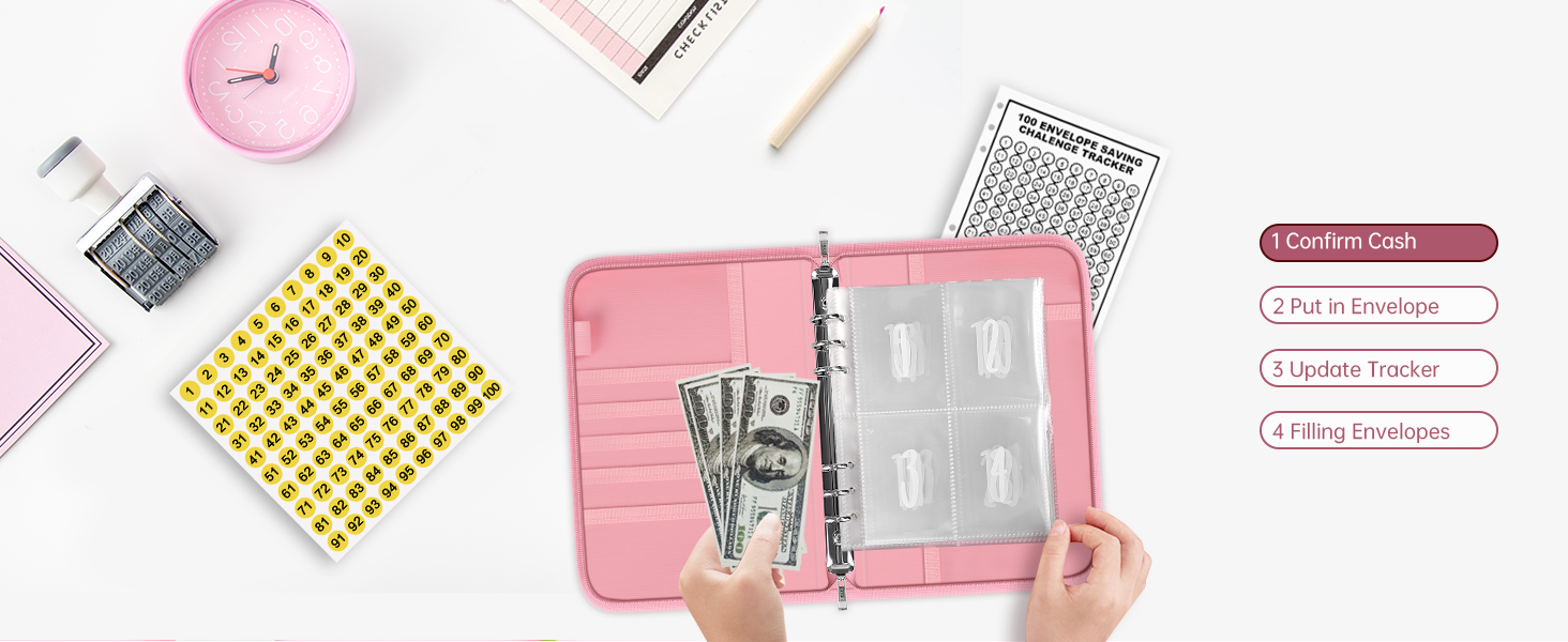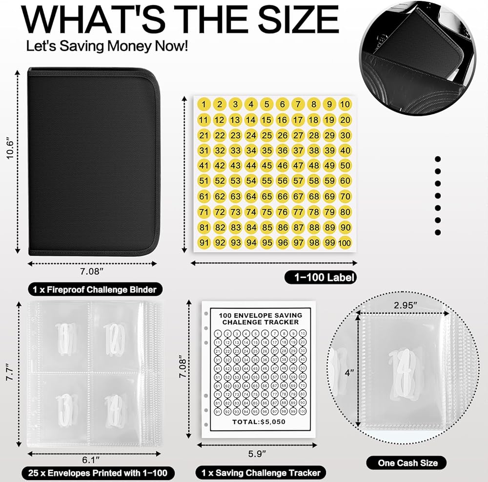 🔥🔥 【Carry and Use】The cash binder is the right size, and the A5 size you can carry with you. You will get the 1xFireproof Challenge Binder, 25x Envelopes Printer with 1-100, 1xSaving Challenge Tracker, 1x1-100 Laber. In addition, the binder comes with: 1x pen holder, 3 x big pocket, 5x card pockets. You can deposit some cash and bank cards.