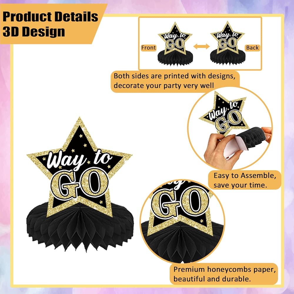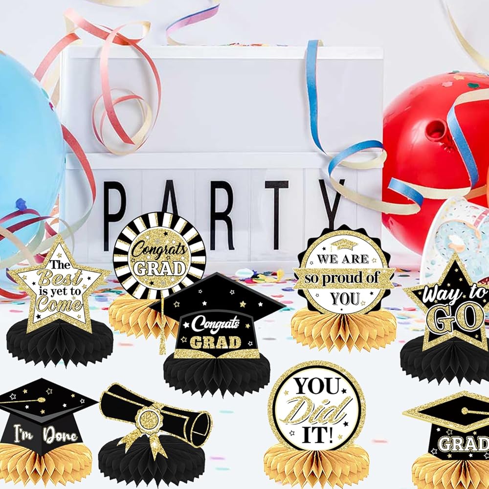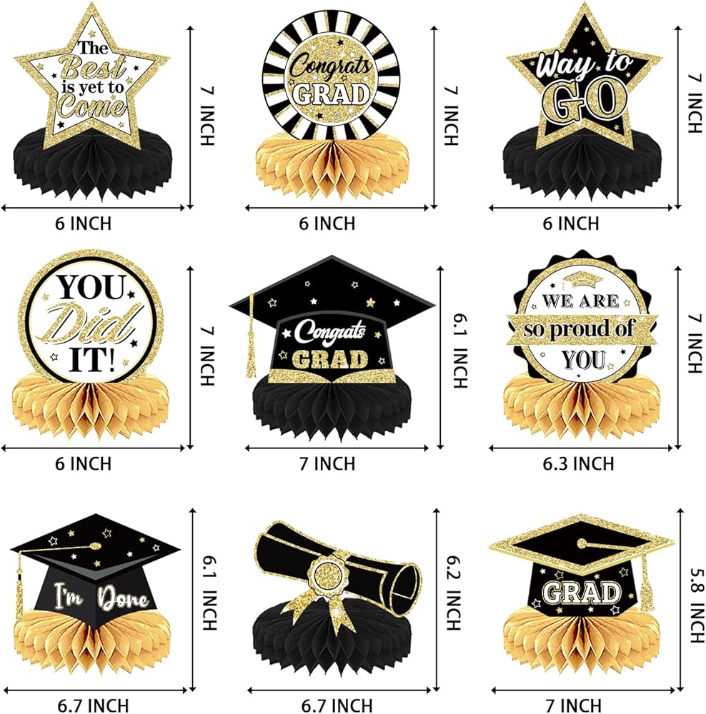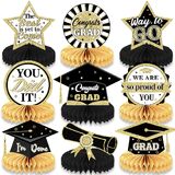 9-Pack Party Supplies, Birthday Party Decorations Honeycomb Centerpieces, Reversible Table Decorations Party Favors, Party Favors 1. Special design: 3D honeycomb style centerpieces, creative and innovative table decorations, make your party table more inviting and attractive when displayed, immerse your guests into the party! 2. Durable material: The honeycombs are made of high-quality paper, and the cards are printed on high-quality double-sided cardboard with a photo-like gloss, durable and non-toxic. 3. Double-sided printing: The cartoon pattern is made of thick cardboard, the honeycomb is made of thin paper, and it is printed with environmentally friendly ink, which will not fade and be durable 4. You will get: 10 x Assorted honeycomb centerpieces a spare glue point Precautions: 1. The product contains small stickers. Please be careful not to let children swallow it by mistake. Bring you and your family an unforgettable Graduation party, both boys and girls will love this decoration, perfect for cheerful party decorations with friends.