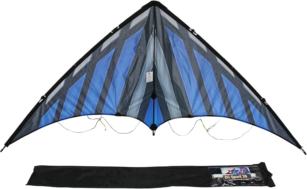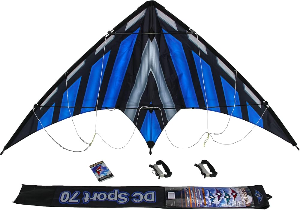 DC SPORT 70 KITE SPECS: 70 Inches Wide, the DC Sport 70 comes with Red DC Sport 70 Dual Control Stunt Kite Sail, Fiberglass Airframe Airframe, 2x Stunt Kite Handles, and 2x 75ft of 75lb Kite Line