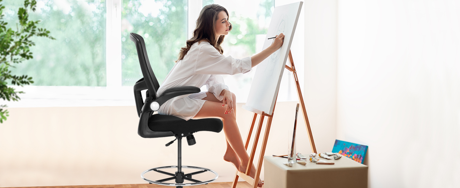 【Premium Quality Standing Desk Chair Construction】Built to last, this drafting office chair features a sturdy nylon base and frame, along with 90° adjustable armrests ideal for various creative endeavors such as architecture drafting, painting, and sewing.