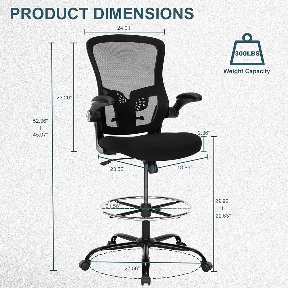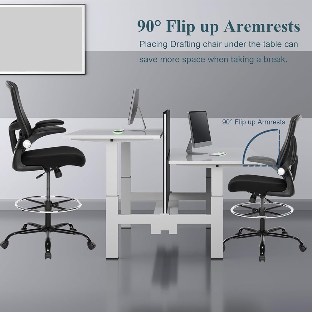 Drafting Chair,Ergonomic Tall Office Chair,Standing Desk Chair with Adjuatable Height,Mesh High Chair with Foot Rest,Stool Chair with Flip up Arms,Counter Height Chairs,Black