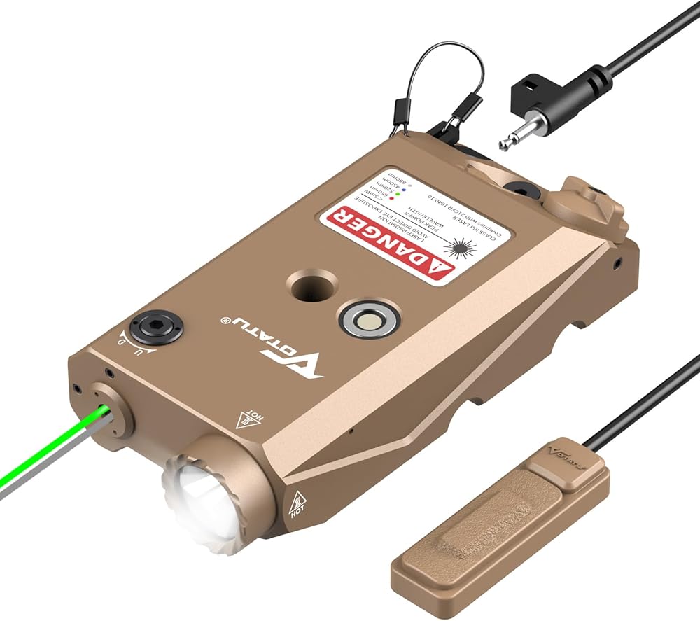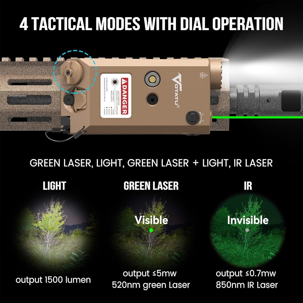 4 Modes for green laser only, tactical light only, green laser and light combined, IR laser only, quickly switch with mode dial. Equipped with solid and strobe function.