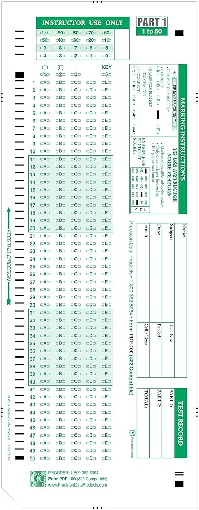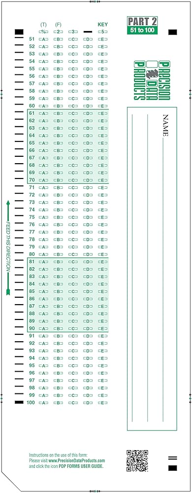 Form Number: PDP 100 Form Size: 4¼" x 11", 2-sided, Form Description: PDP 100 Test Form, 100 Questions, 5 Choice Response (A-E), PDP 100 can be used with Item Analysis Form PDP 9700, Subjective Score Area, 888P, 888P+, Score compatible,