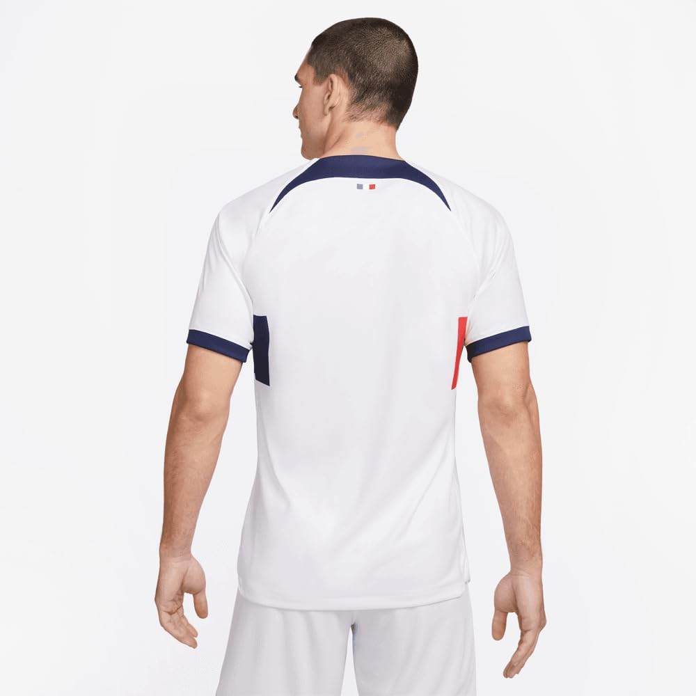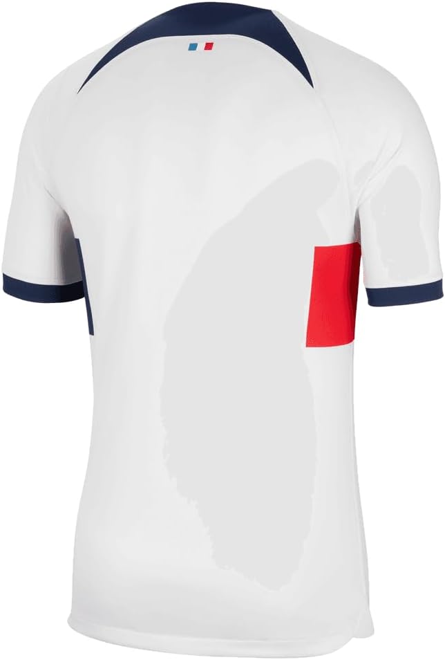 The inspiration for the PSG 2023-2024 Away kit comes from La Ville Lumiere (City of Light). The white shirt features a graphic fading from red to blue, mimicking the way the iconic lights of Paris fade into the night sky. The inner pride features the team name, while the outer pride features the French flag. The shirt pairs replica design details with sweat-wicking technology to give you a game-ready look inspired by your favourite team.PersonalisationName & Number - Customise your jersey with the name and number of your favourite PSG player or even your own name. We can print name in the same style worn by the players.