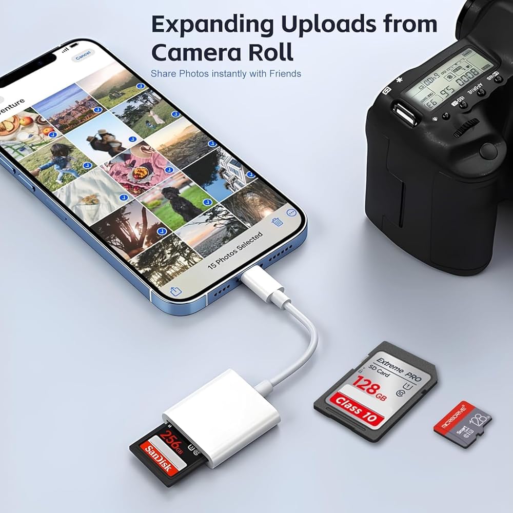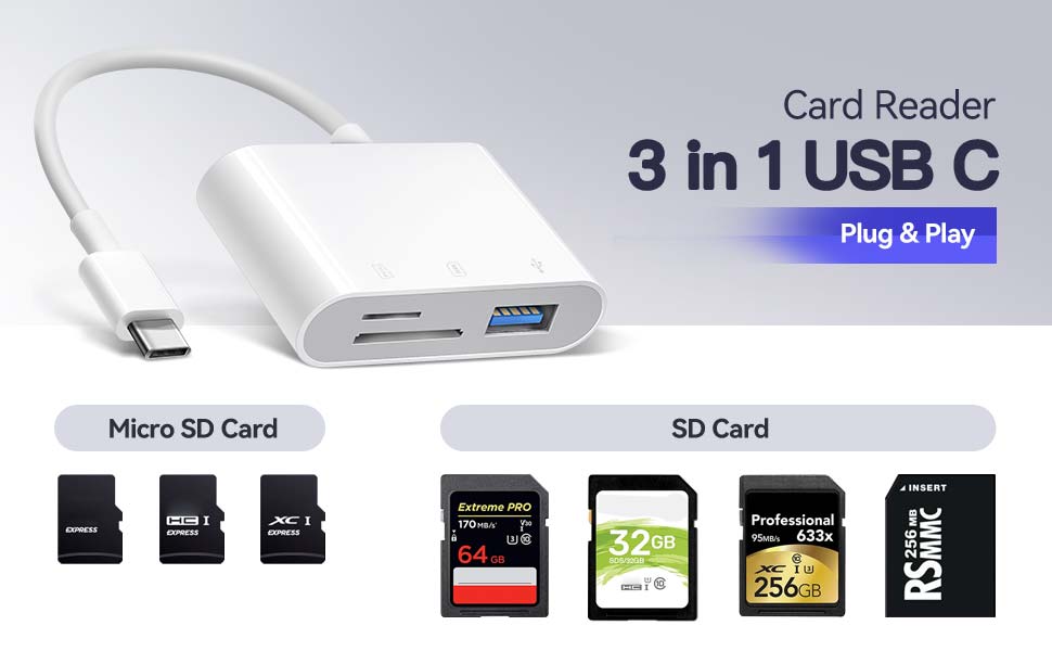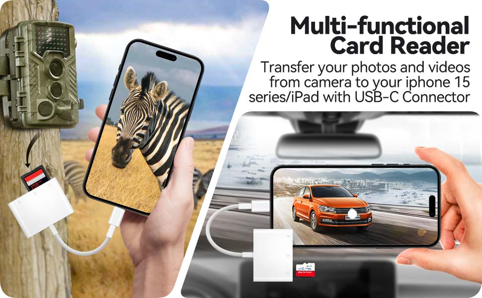 【Share Quickly】About this USB-C SD card reader let you to easily copy photos and videos from your camera memory cards to your mobile phone or iPad Pro/Air, and share your joy with your father, mother and relatives in time. If you need photographer's assistant, CF/SD/MicroSD memory cards have professional design to support your files at anytime.