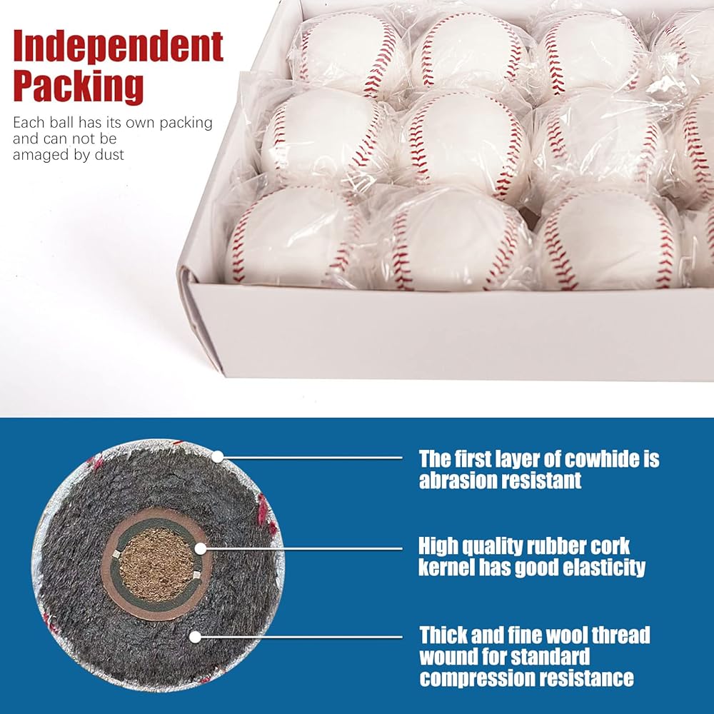 ⚾【OFFICIAL SIZE】:Standard size and weight baseballs (9 inch circumference, weight: 5 oz), stitches:108, box of 12 balls(ONE DOZEN). You will have a good experience with the sport baseball. Super Seam Technology make seams 20% higher than raised seam baseballs, pitchers experience superior control on the mound. Standard size and weight making them the best choice of leagues, coaches, parents, and players in America.