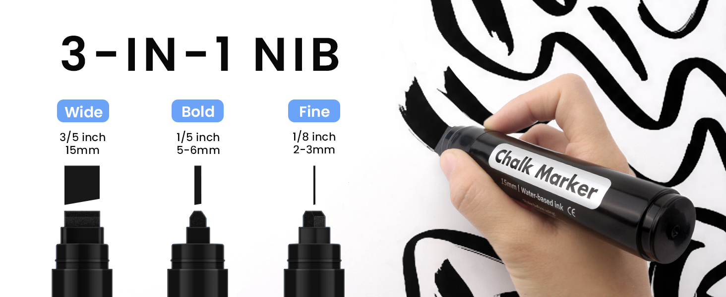 Versatile 15mm White Chalk Marker: The 3 IN 1 NIB Rectangular Felt Tip enables you to create a variety of designs, from wide lines to bold strokes and intricate fine lines(Jumbo 3/5 inch and Bold 1/5 ~ 1/4 inch and Fine 1/9 ~ 1/8 inch). The thick liquid chalk marker pen pupation design produces smooth and even ink, hardly skipping or breaking lines.