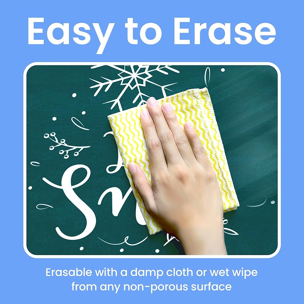 Wet Erase Chalk Markers: The liquid chalk marker's water-based ink is washable, delivering smudge and dust-free, flowing lines that dry quickly. This erasable chalk marker line cleanup is a snap – just wipe away with a damp cloth, leaving surfaces pristine.