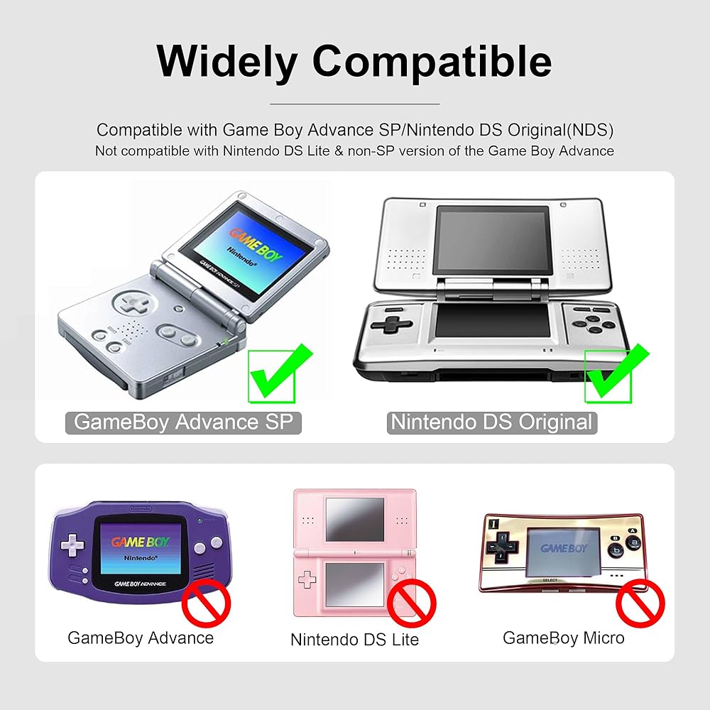 NOT compatible with Nintendo DS Lite(NDSL) & non-SP version of the Game Boy Advance(GBA)