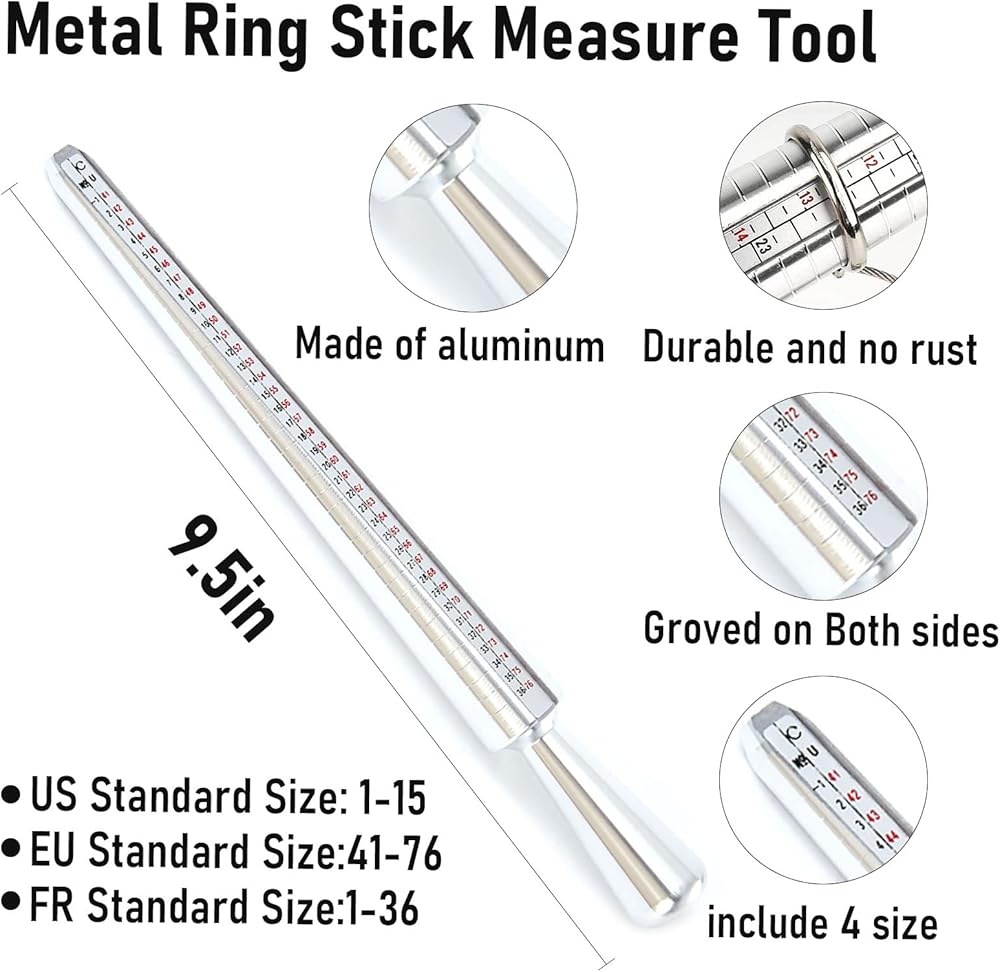 💍【4 Size Ring Sizer Measuring Tool】The metal ring rod measuring tool specially designed for measuring rings comes with 4 sizes: US sizes of 1-15 (Specific to quarter size), European size (CU 41-76 ), Japanese size (m/m∮1-34), FR Standard Size 1-36. which can meet the measurement needs of different sizes of fingers.