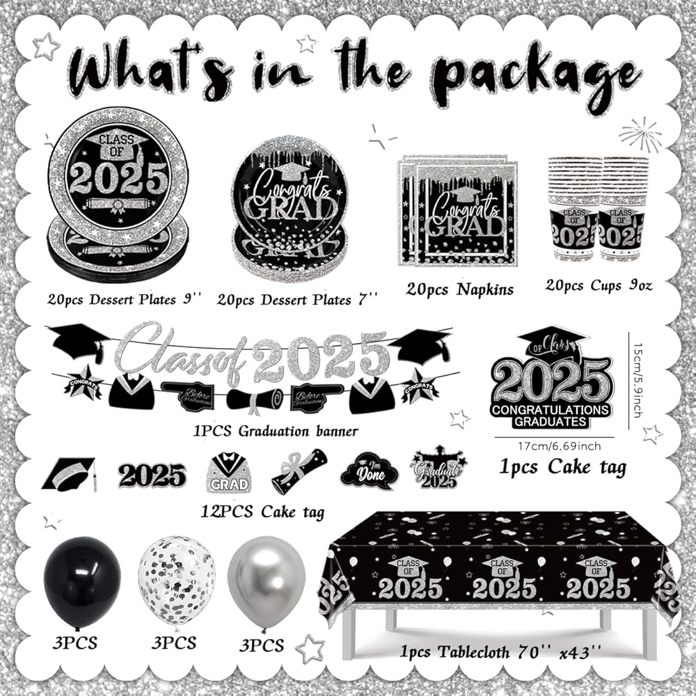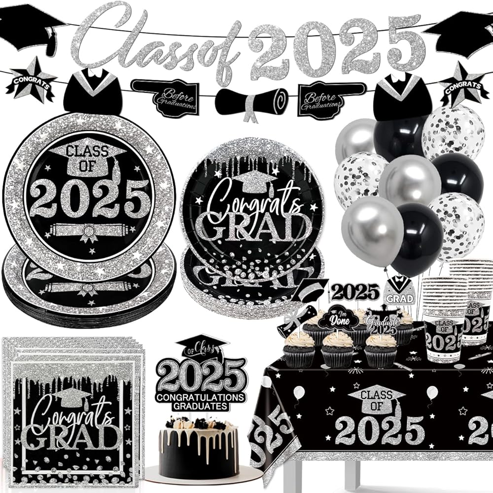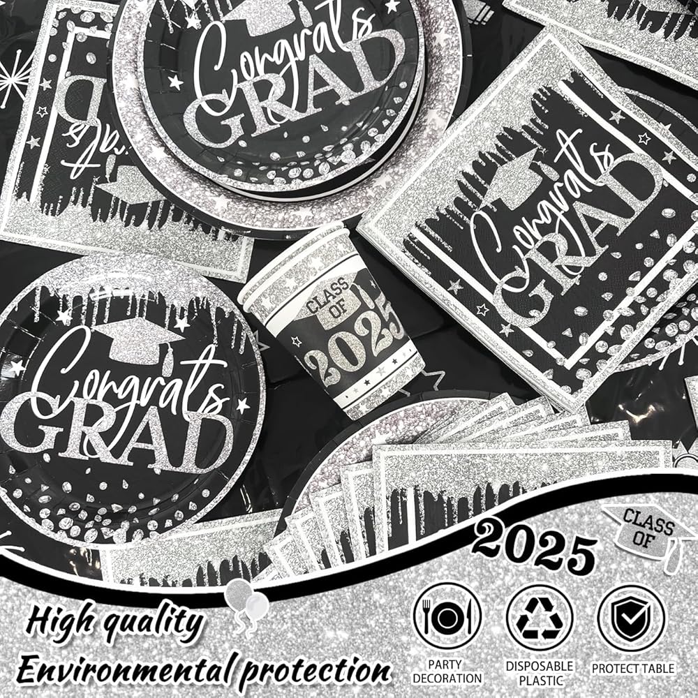 121 قطعة من أطباق ومناديل حفلات التخرج من Zhynice، ديكورات التخرج باللونين الأسود والفضي، فئة 2024، أكواب التخرج، مفرش المائدة، مجموعة أواني الطعام للاستعمال مرة واحدة من أجل مستلزمات حفلات التخرج، تخدم 30
