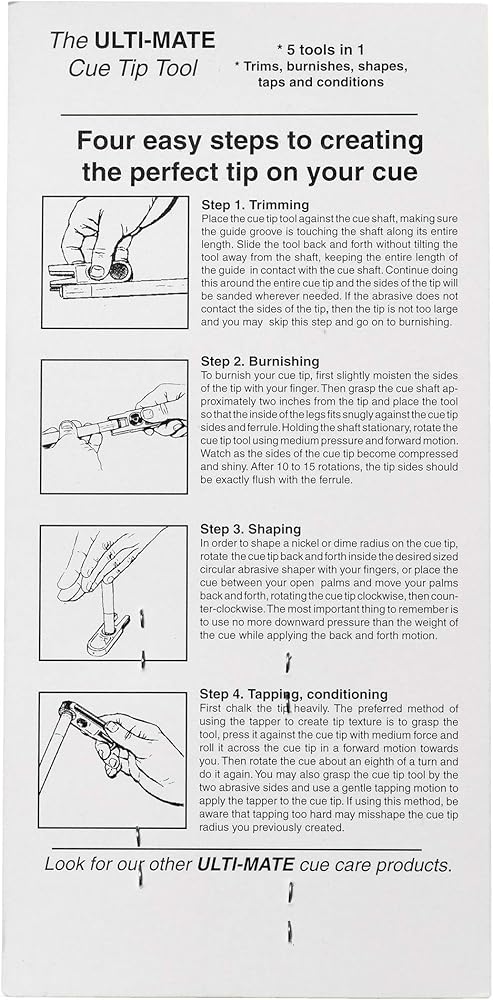 NEW material of the body: HI-DENSITY PLASTICS *** CHOOSE YOUR COLOR *** 1 set (4 pcs) of replacement abrasives is included. Instructions on how to remove and replace the abrasives are included. Easily fits in the cue case pockets - Sharp metal teeth tap chalk into cue tip, and can also be used to scuff a badly glazed cue tip - The Shaper on the back of the cue tip tool shapes and scuffs the cue tip to a Dime radius. The one on the front shapes and scuffs the cue tip to a Nickel radius- Trims cue tip sides to within .010" of flush with ferrule - Burnishes, hardens and polishes cue tip sides exactly flush with ferrule. Product specifications: · Material: Hi - Density Plastics of the body and nickel plated brass tapper · Size: 3,2" x 1" x 0.35" (82 х 25 х 9 mm) · Net weight: 40 gr (1.41 oz.) · Gross weight: 50 gr (1.76 oz.) - Package size: 8.3" x 4" x 0.4" (21 х 10 х 1 cm) - Made in the USA.