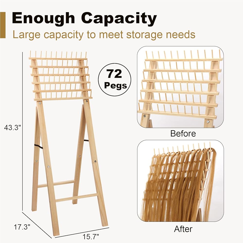 【No Tangle】: The height of our standing hair rack is 43.3”, which is tall enough for you to take the hair without your stoop and the hair can be hung vertically on the rack and kept separate without tangle; Each peg is 1.7 inch long and 1.3 inch apart