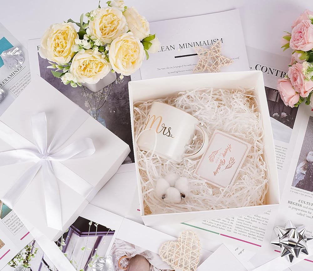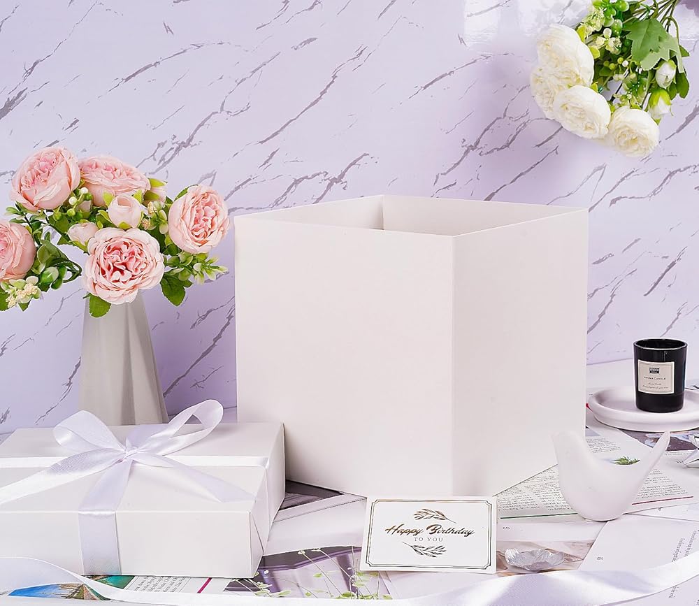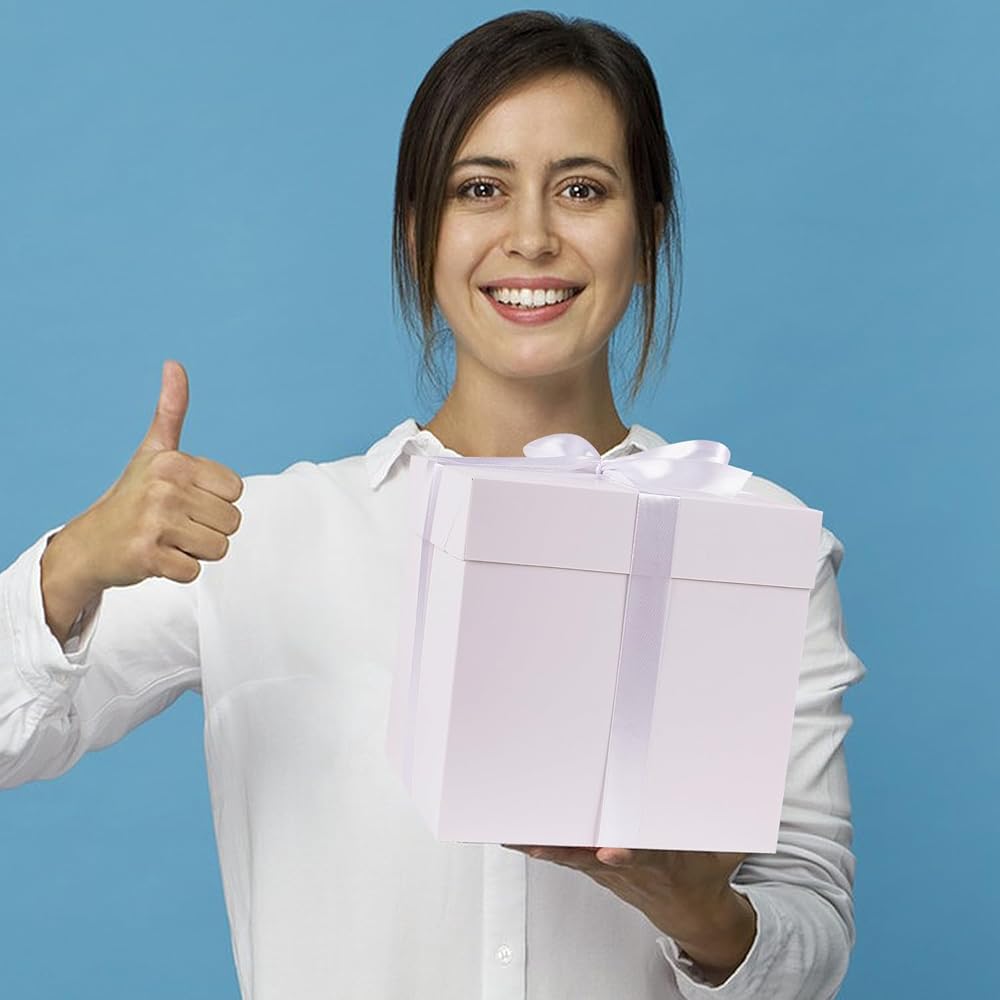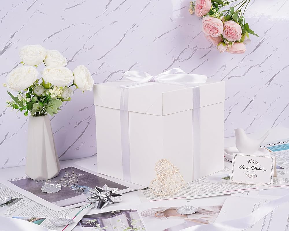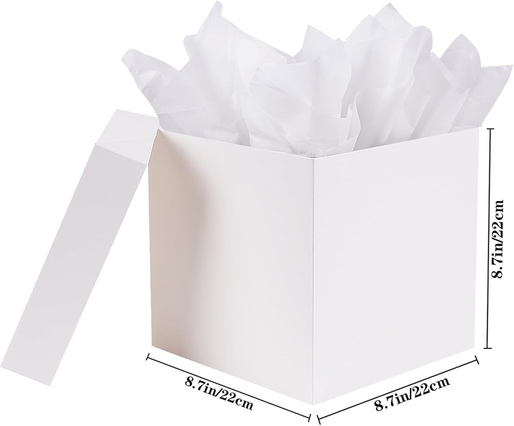 Jaywayang Medium White Gift Box with Lids, Ribbon and Tissue Paper, Collapsible, for Birthday, Anniversaries, Wedding, Mother's Day, 8.7x8.7x8.7 Inches