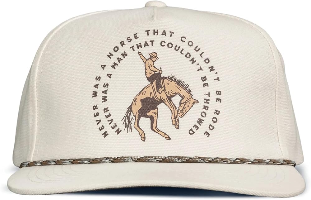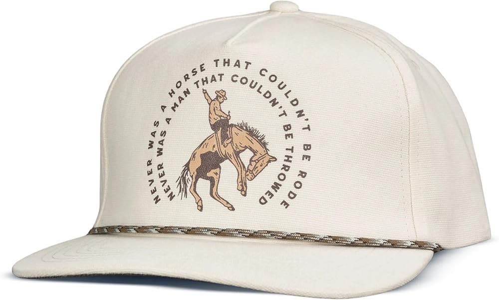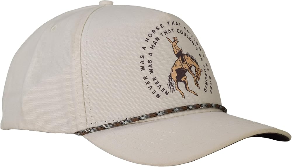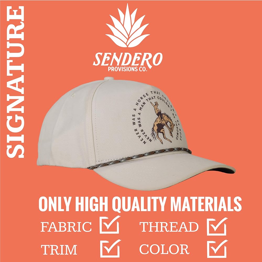 Sendero Provisions Co. SPCH124S19AZZ Never Was a Horse Hat Off White Unisex Structured 5-Panel Brushed Canvas Screen Printed Design Snapback Paracord Rope Hat Description: “Never was a horse that couldn't be rode, never was a man that couldn't be throwed.” A wise ol' cowboy told us this one day. Said once he understood it, it changed his whole life. So we took it to heart! Long story short: turns out the Sendero boys aren't gritty enough to be real cowboys.Key Features: • A Name You Can Trust: We've been doing this a while now. We made our first product back in 2014 and we've been making everything better ever since. We craft each product individually and care goes into every detail. • Only High Quality Materials: We hand select every fabric, trim, thread, and color that goes into a Sendero product. We don't use blanks- we've developed our own style and unique fits that folks have come to know and expect. • Designs That Inspire: We're not trying to put “Sendero” in as many different ways as we can onto our gear. We do that sometimes, but what gets us excited is funky cool art with a Western twist and maybe a silly joke or two. • Carefully Crafted: Our hat showcases a screen printed "never was a horse" design, adding a distinctive touch to your outdoor style. With its eye-catching off-white and convenient snapback closure, this hat ensures a comfortable and personalized fit for your adventures.Pack Includes: (1) Sendero Provisions Co. Never Was a Horse Snapback Hat