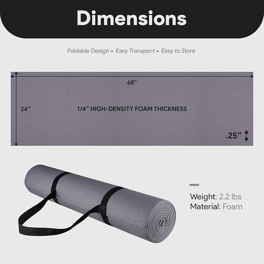 68" long 24" wide ensures comfort for people of all shapes and sizes. With high density eco friendly material, the 1/4'' thick premium mat comfortably cushions spine, hips, knees and elbows on hard floors while keeps you balanced.