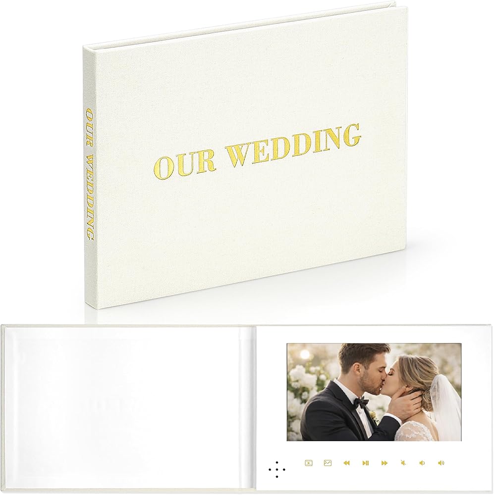 Timeless Elegance: Luxurious Linen Bound Decor Wrapped in luxurious linen and adorned with elegant foil titles, our video book is not just a device, but a timeless keepsake to celebrate life's most precious moments.
